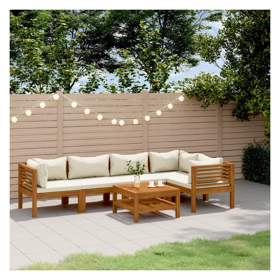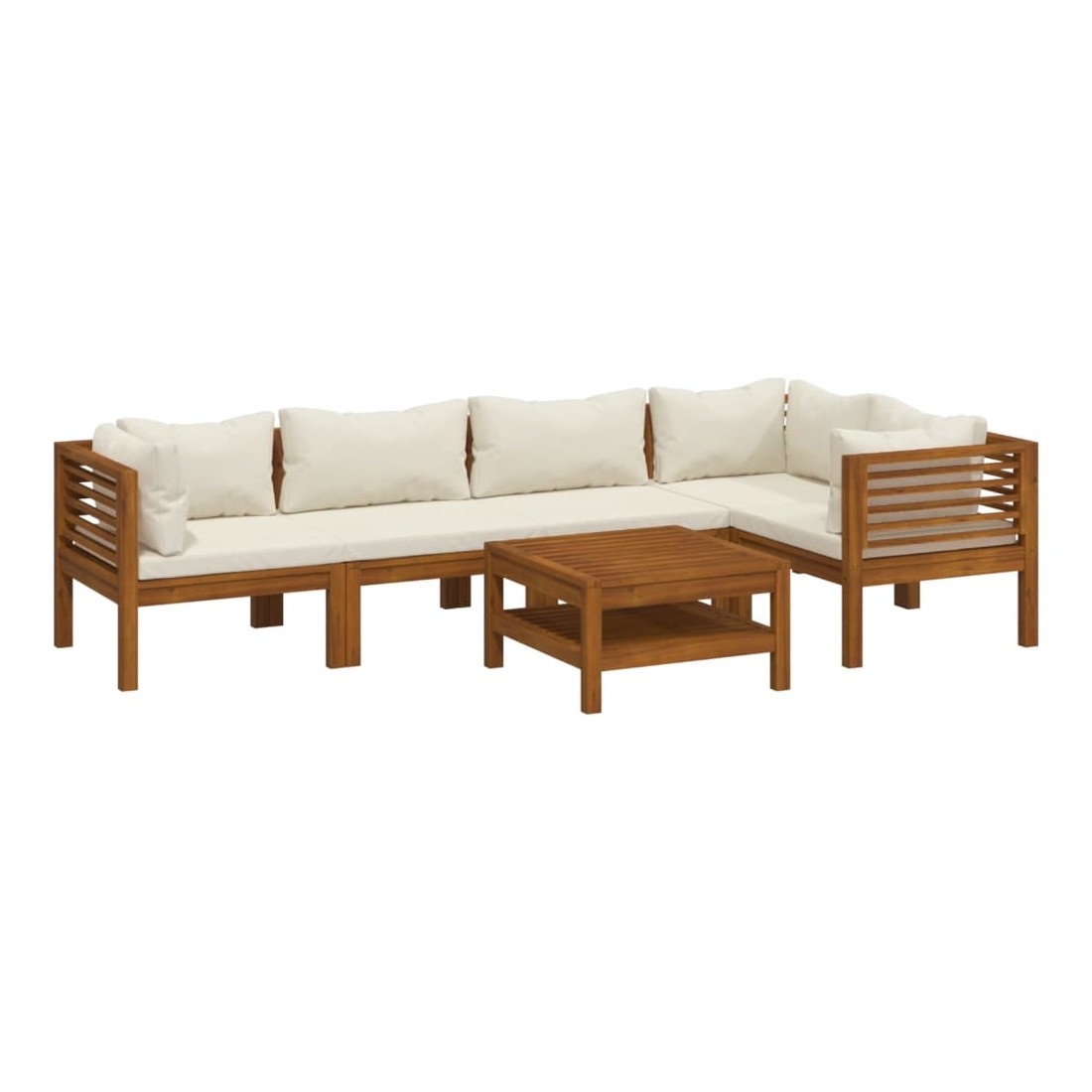 Ce mobilier de jardin en bois est une combinaison parfaite de style et de fonctionnalité. Avec cela dans votre jardin, vous pouvez passer du temps relaxant et apaisant avec votre famille et vos amis. Doté d'un cadre en bois d'acacia massif, l'ensemble de canapé est solide, robuste et durable; et sa finition à l'huile rend l'ensemble de canapé adapté à une utilisation en extérieur. Les coussins amovibles sont bien rembourrés, afin d'offrir un grand confort d'assise. Une table basse au design à lattes unique est également incluse. De plus, grâce à sa conception modulaire, toutes les pièces peuvent être arrangées et personnalisées selon vos besoins. Cet ensemble de sièges d'extérieur sera sûrement le point de mire de votre jardin ou patio. Remarque : afin de prolonger la durée de vie des meubles d'extérieur, nous vous recommandons de les protéger avec une housse imperméable.