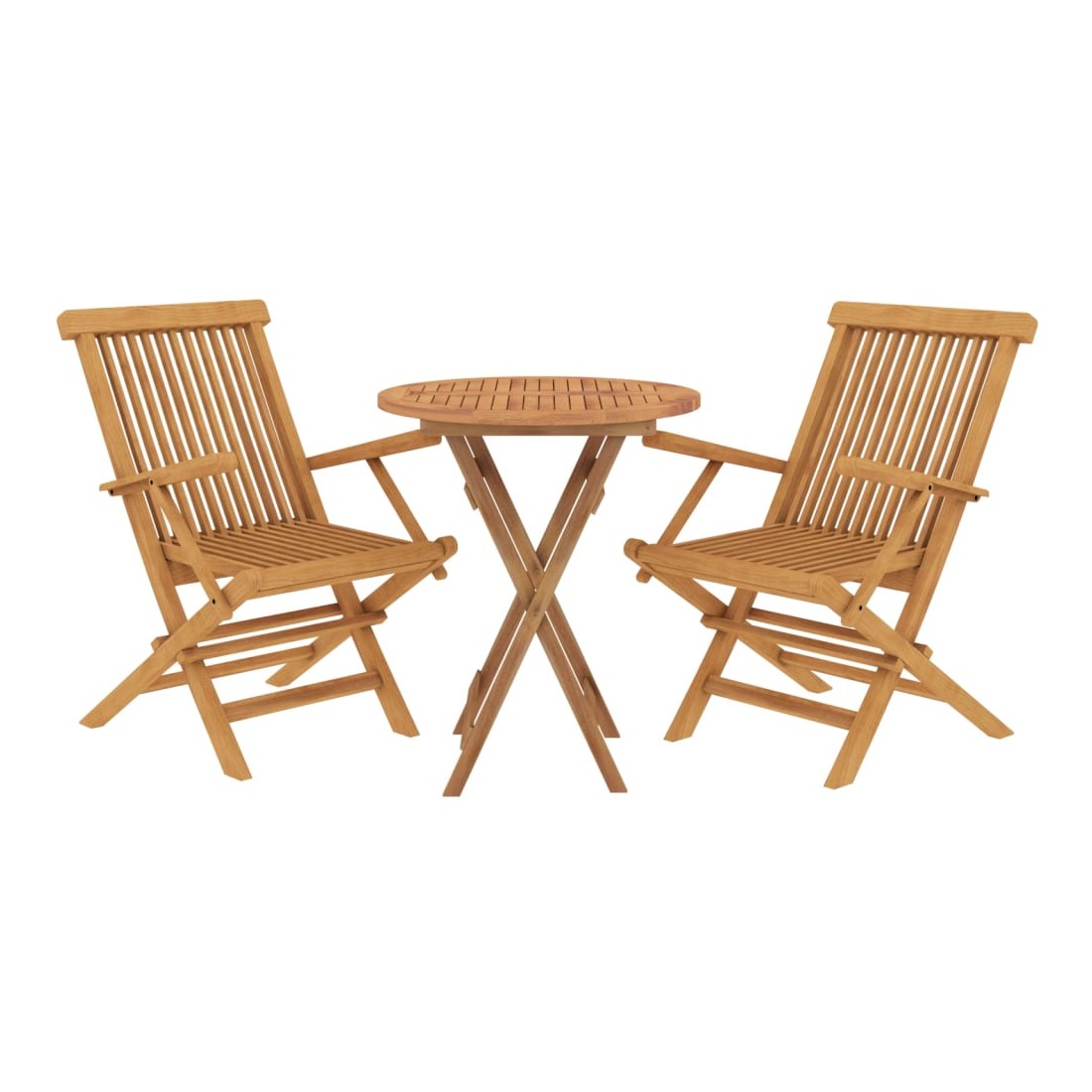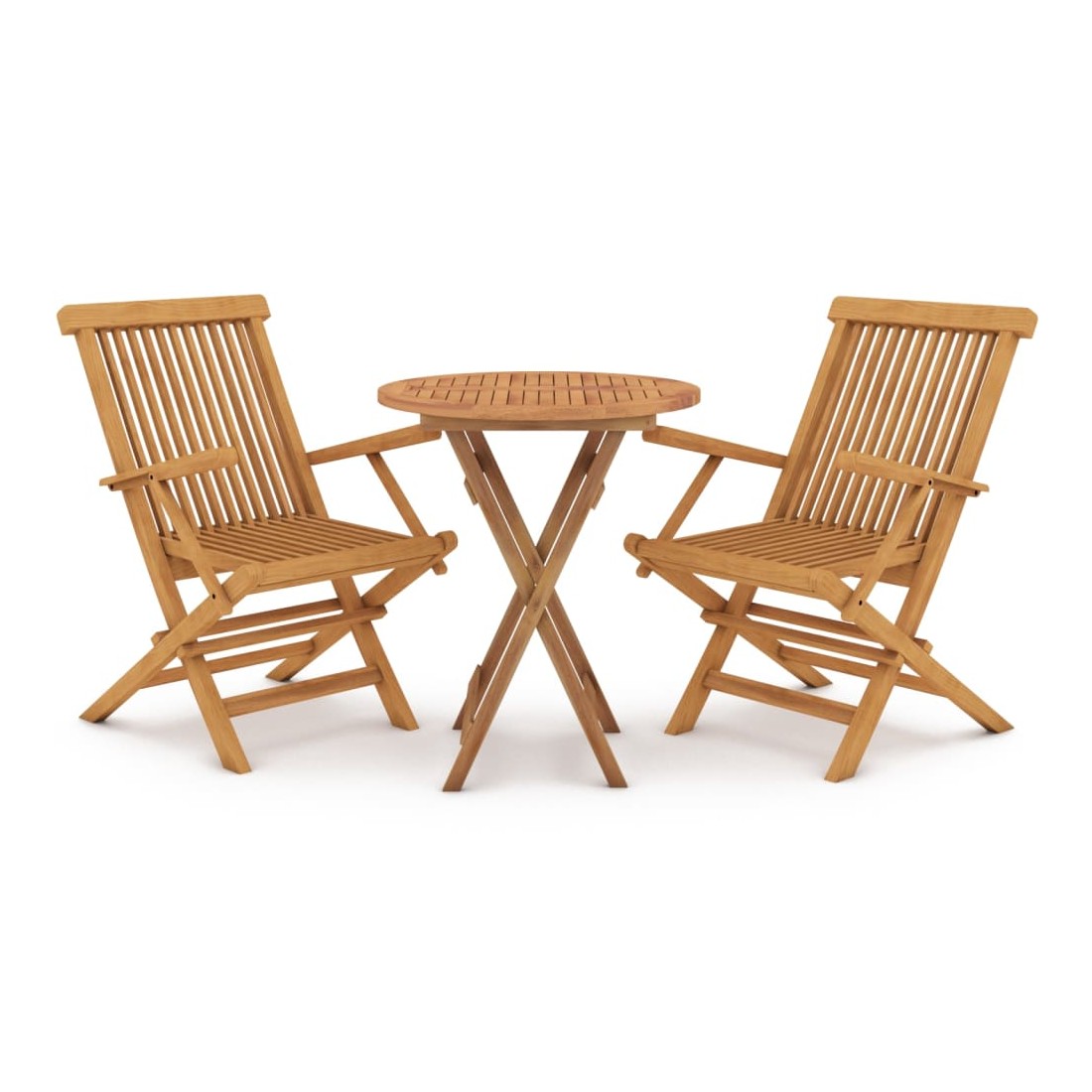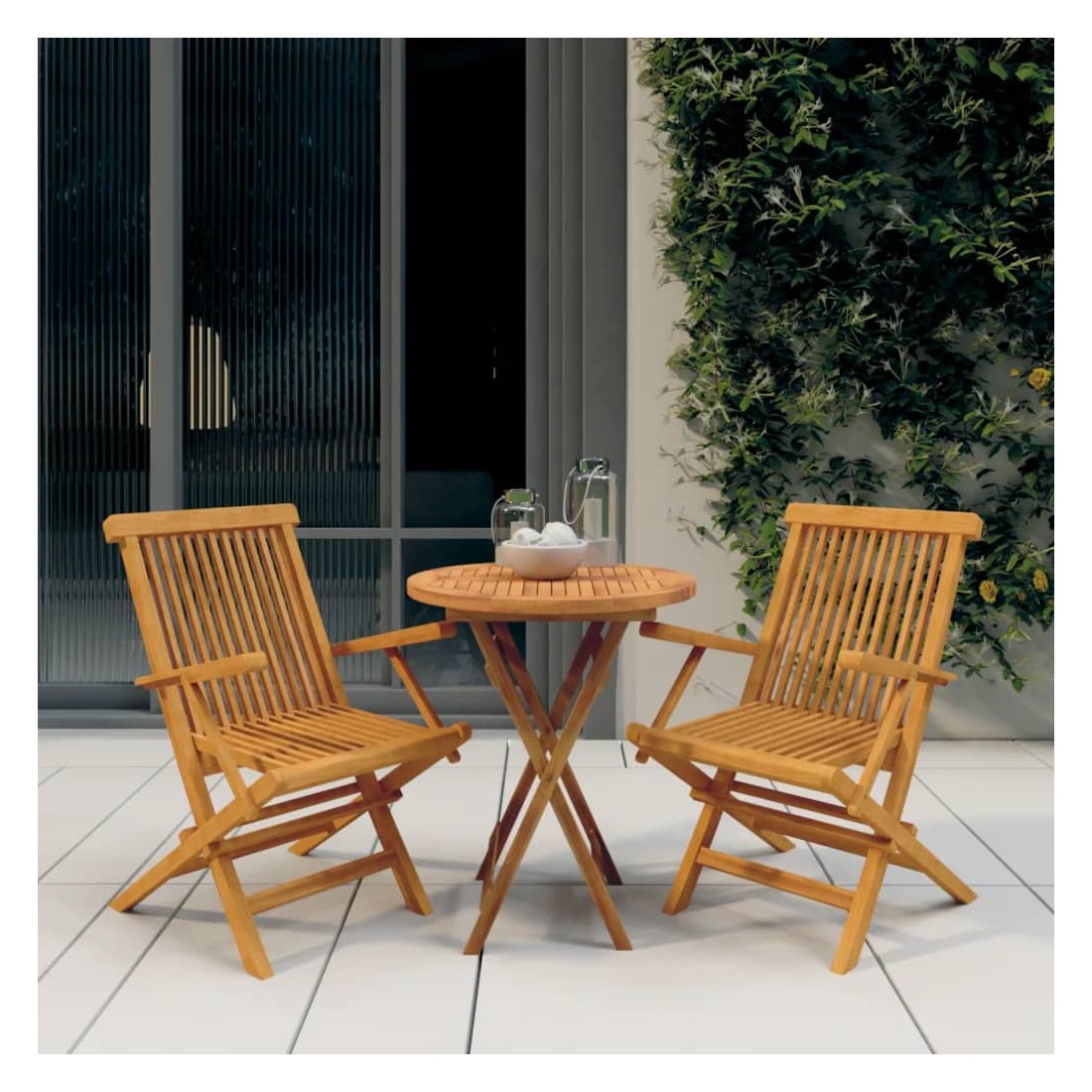Cet ensemble de salle à manger de jardin en bois, au design élégant, est un excellent choix pour vos repas ou vos moments de détente sur votre patio ou dans votre jardin. Bois de teck massif : le bois de teck massif est un matériau naturel magnifique. Il a été chevronné, séché au four, puis sablé finement pour lui donner une apparence très lisse. Le bois de teck est connu pour sa résistance exceptionnelle et sa résistance aux intempéries.Cadre robuste : le cadre en bois assure robustesse et stabilité.Design pliable : ces chaises et table en bois peuvent être facilement pliées lorsqu'elles ne sont pas utilisées. Remarque :Afin de prolonger la durée de vie de votre mobilier d'extérieur, nous vous recommandons de le protéger avec une housse imperméable.