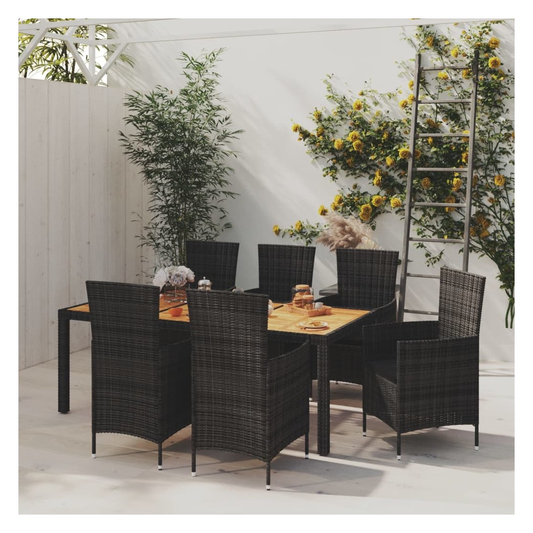 vidaXLAvec un design élégant et un cadre en acier durable, cet ensemble de meubles de salle à manger est un choix parfait pour votre espace de vie extérieur. Cet ensemble de salle à manger de jardin dispose d’un cadre en acier enduit de poudre, ce qui rend la table et les chaises stables et durables. Grâce à la résine tressée résistante aux intempéries, les meubles d'extérieur sont faciles à nettoyer. Les coussins sont amovibles et faciles à nettoyer. De plus, les coussins épais ajoutent un confort d'assise supplémentaire. Remarque : afin de prolonger la durée de vie des meubles d'extérieur, nous vous recommandons de les protéger avec une housse imperméable.