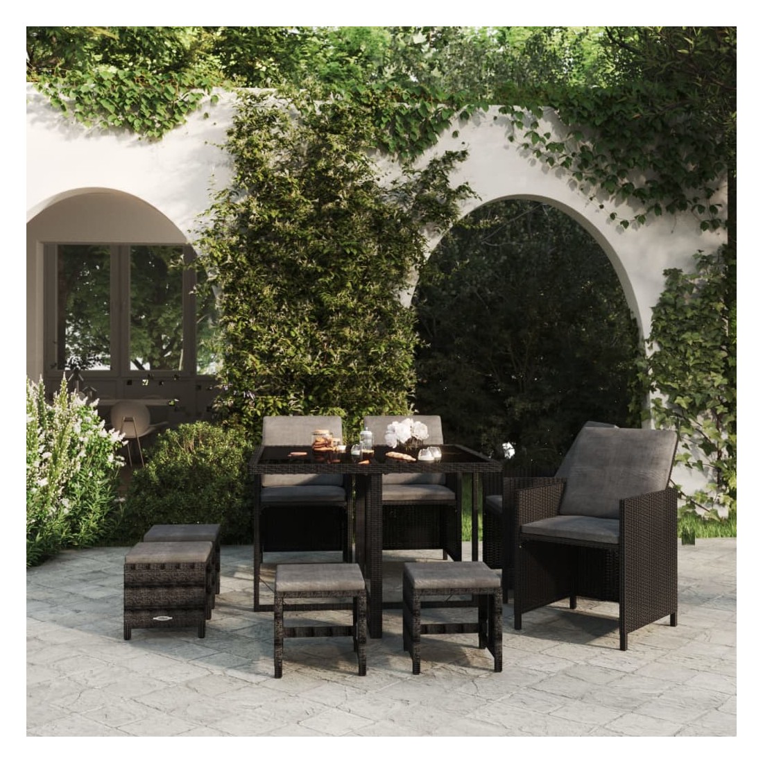Cet ensemble élégant de salle à manger de jardin vous permet de passer des moments agréables et confortables avec votre famille et vos amis. Fabriqué en résine tressée résistante aux intempéries et imperméable, cet ensemble de salle à manger d'extérieur est facile à nettoyer, résistant à l'usure et adapté à une utilisation quotidienne. Le cadre en acier enduit de poudre rend la table, les chaises et les tabourets robustes et durables. Le dessus de table en verre est idéal pour placer des boissons, de la nourriture ou des objets décoratifs. Les coussins d'assise et de dossier épais et souples, remplis de mousse, ajoutent également au confort d'assise. De plus, vous pouvez tirer le dossier vers le bas et ranger les chaises sous la table, économisant ainsi un espace de rangement précieux lorsque l’ensemble n’est pas utilisé. Grâce à la construction légère, tous les articles sont faciles à déplacer. Remarque : afin de prolonger la durée de vie des meubles d'extérieur, nous vous recommandons de les protéger avec une housse imperméable.