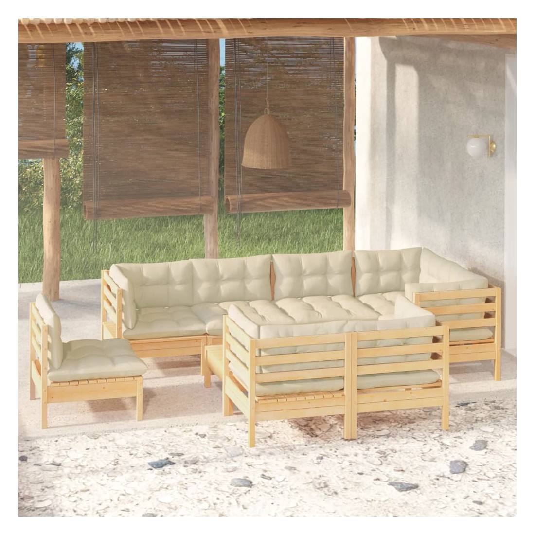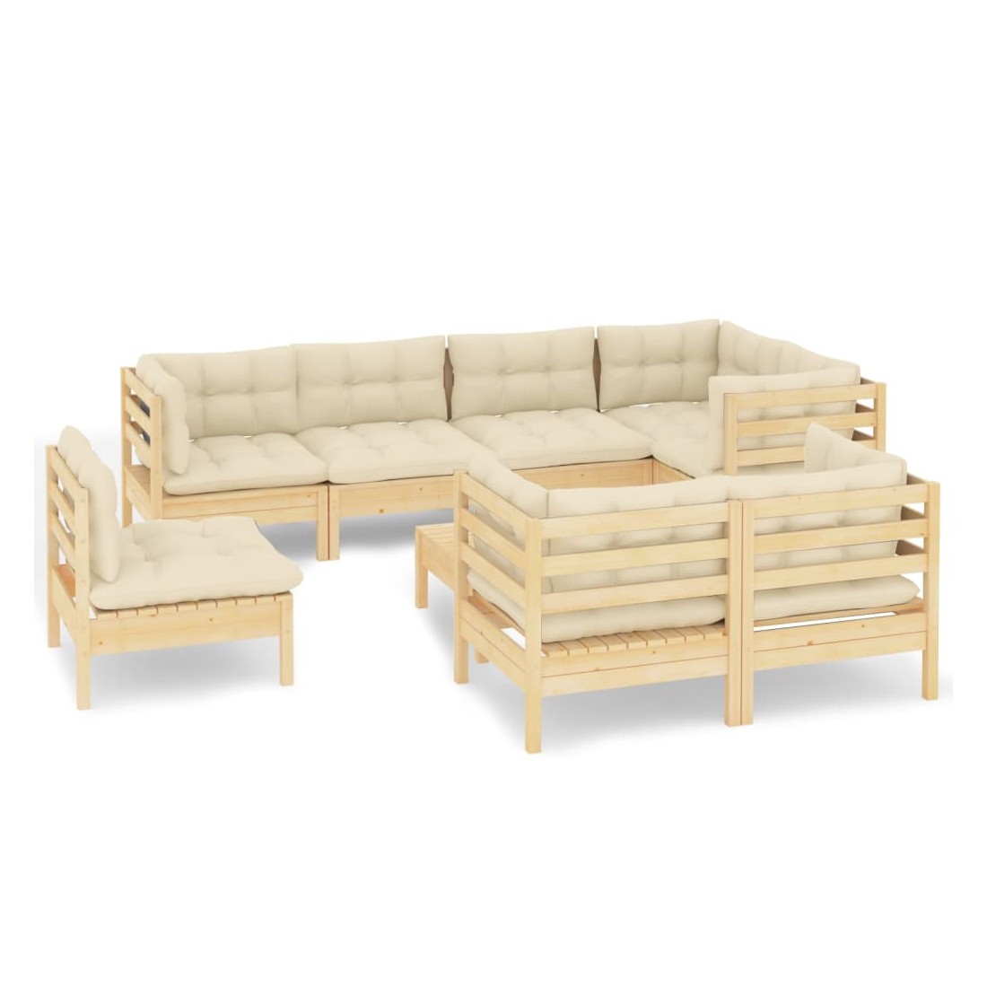 Salon de jardin 9 pcs avec coussins crème bois de pin massif