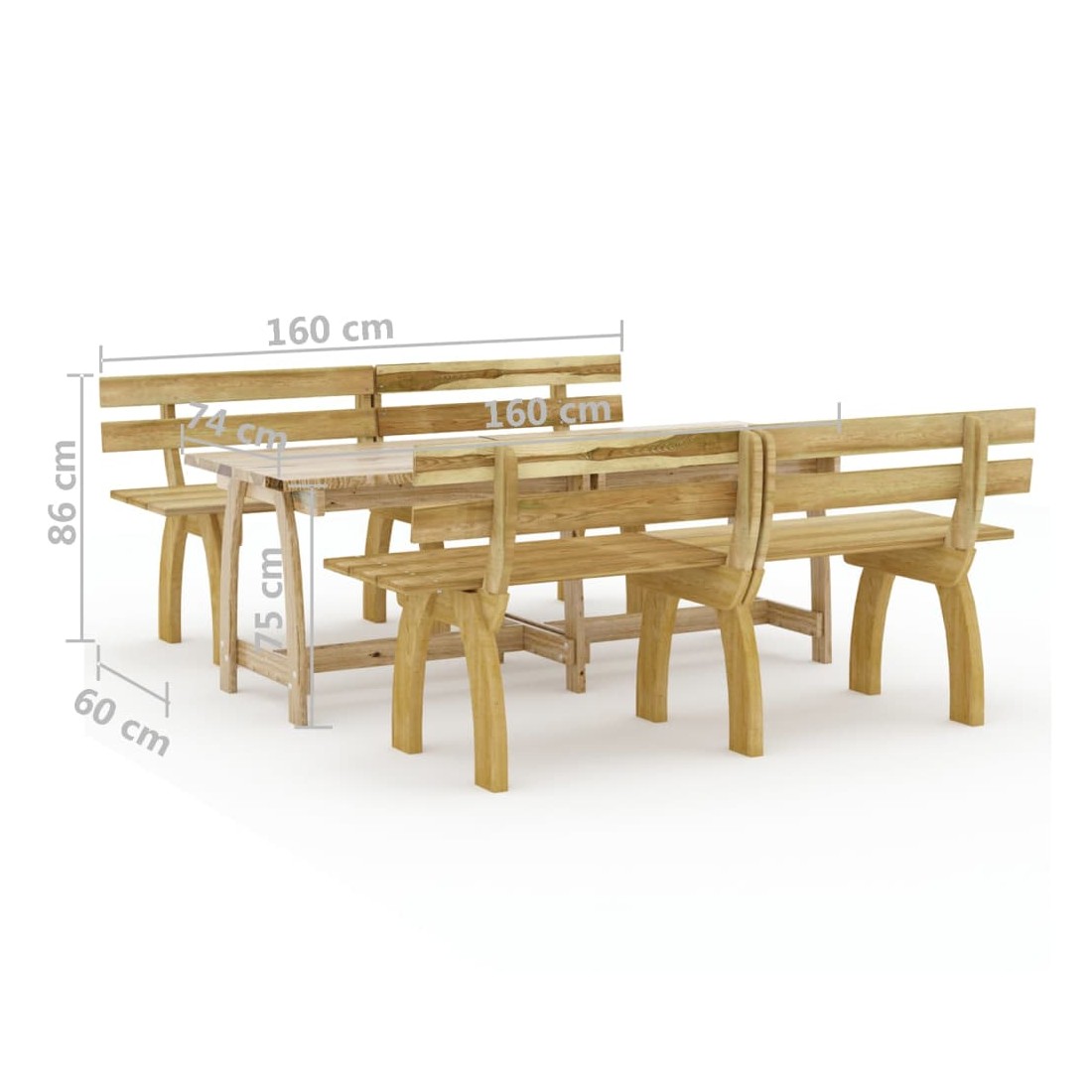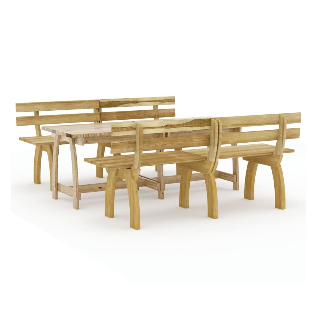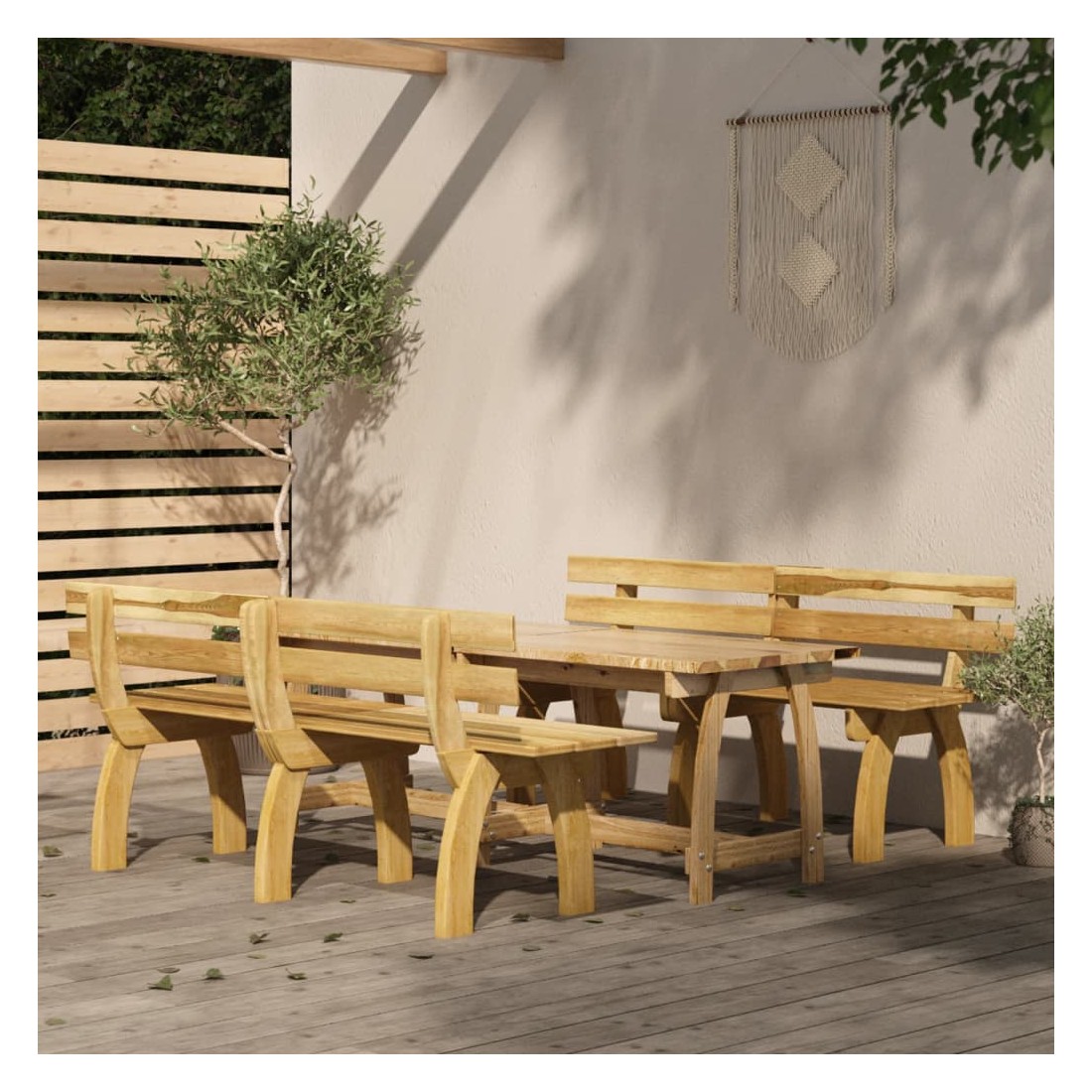 Avec un design élégant mais pratique, cet ensemble de salle à manger de jardin sublime votre espace de vie extérieur ! Fabriqué en bois de pin imprégné de vert, cet ensemble de salle à manger de jardin en bois est très solide, durable et résistant à la corrosion. Cet ensemble de meubles est un choix idéal pour les moments de détente dans un jardin de maison de campagne romantique ou près d'un étang de jardin idyllique pour dîner en famille et entre amis. Veuillez noter que le bois est un produit naturel et peut présenter des imperfections. Remarque : afin de prolonger la durée de vie des meubles d'extérieur, nous vous recommandons de les protéger avec une housse imperméable.