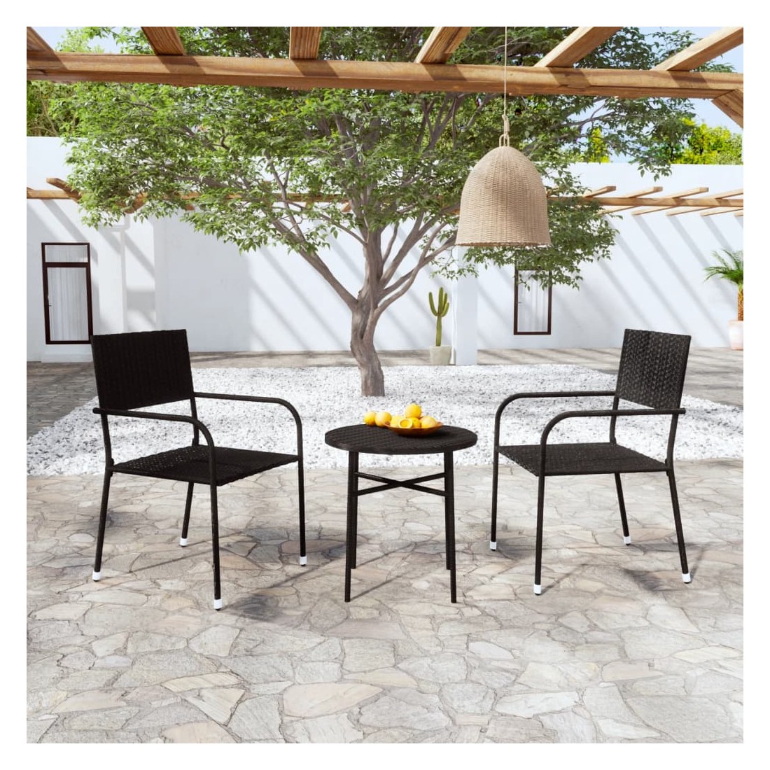 Profitez d'un bon repas ou d'un thé l'après-midi dans votre espace extérieur avec cet ensemble de salle à manger de jardin en résine tressée ! Ayant un design élégant, il deviendra le point central de votre jardin et de votre terrasse ! L'ensemble de salle à manger d'extérieur pratique a un cadre en acier enduit de poudre recouvert de résine tressée, ce qui le rend résistant à l'usure, facile à nettoyer et adapté à une utilisation quotidienne en plein air. La table est excellente pour garder les boissons et la nourriture à portée de main. Les chaises sont légères et peuvent être empilées pour économiser de l'espace lorsqu'elles ne sont pas utilisées. Remarque : afin de prolonger la durée de vie des meubles d'extérieur, nous vous recommandons de les protéger avec une housse imperméable.