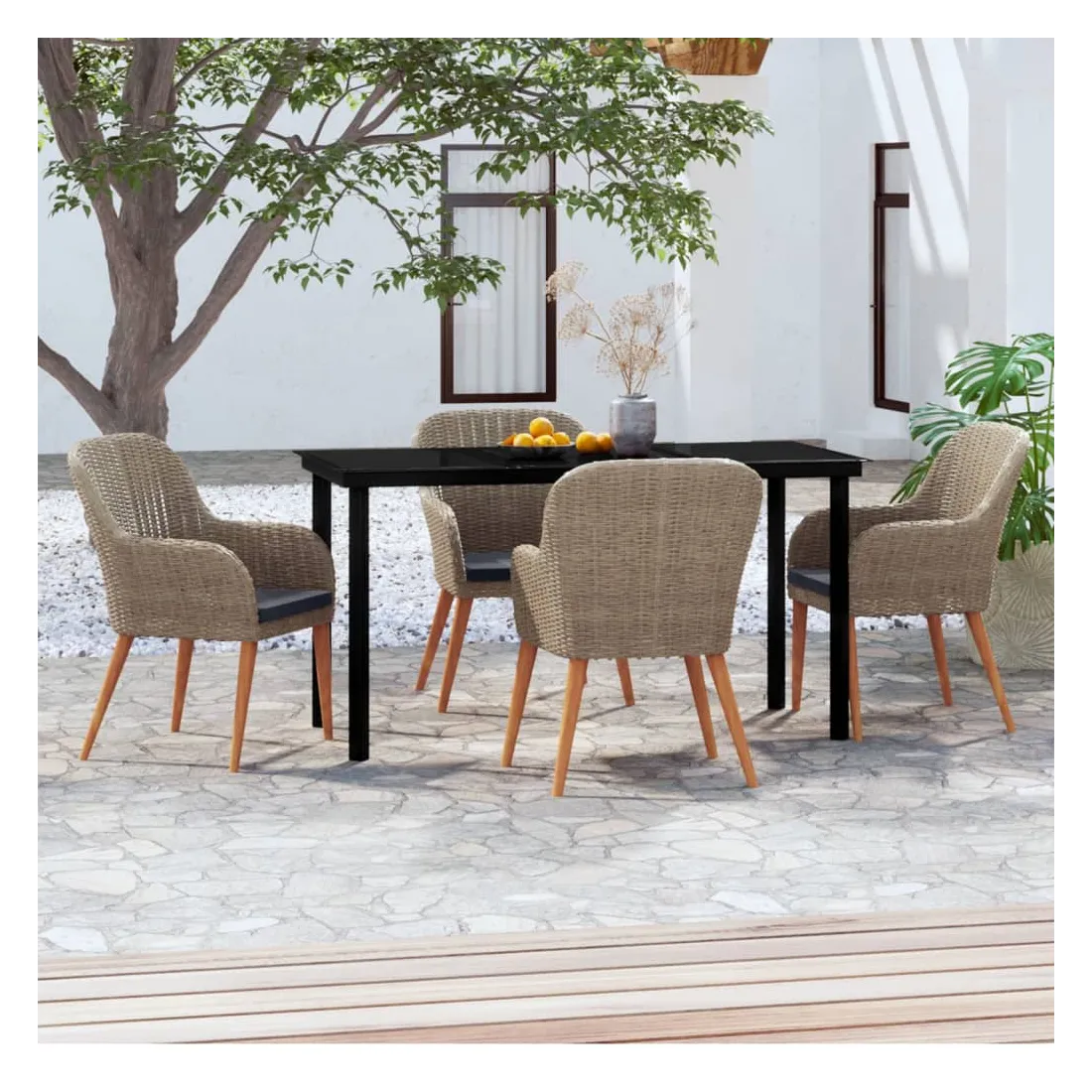 Cet élégant ensemble de salle à manger de jardin est destiné à être le point de mire de votre jardin ou patio ! C'est un excellent choix pour les repas en plein air ou pour vous détendre dans l'espace extérieur ! Les cadres en acier endui de poudre rendent la table et les chaises solides et stables pour une utilisation quotidienne en extérieur. Grâce à la résine tressée résistante à l'eau, les chaises sont faciles à nettoyer et résistantes à l'usure. La forme ergonomique et les coussins amovibles bien rembourrés en mousse offrent un confort d'assise optimal. Les housses de coussin en polyester, qui nécessitent peu d'entretien, peuvent être facilement retirées et lavées. En outre, le dessus de table en verre lisse est facile à nettoyer avec un chiffon humide et est parfait pour placer d