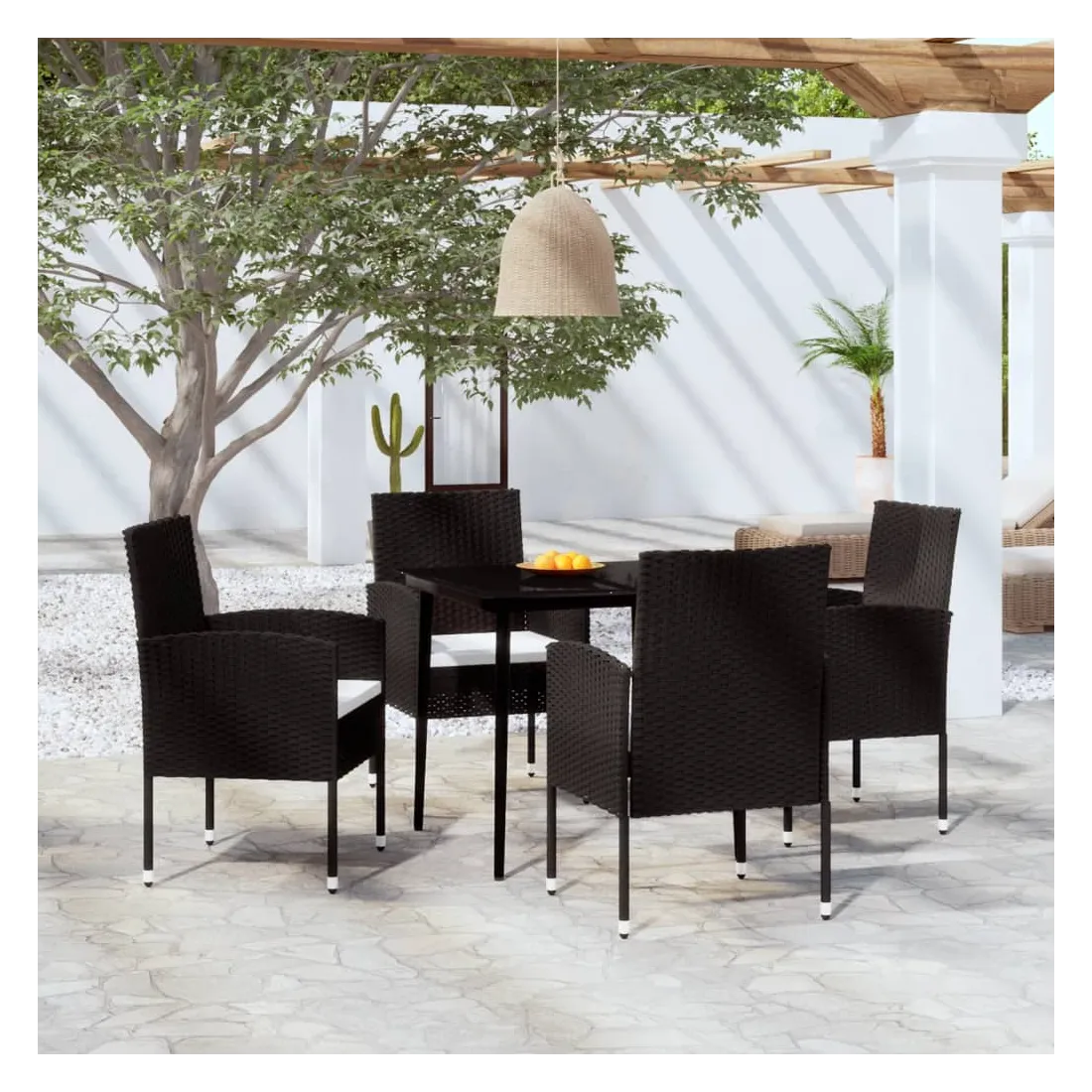 Profitez d'un bon repas ou d'un thé l'après-midi dans votre espace extérieur avec cet ensemble de salle à manger de jardin ! Ayant un design élégant, il deviendra le point central de votre jardin et de votre terrasse ! Cet ensemble de salle à manger d'extérieur pratique est doté d'un cadre en acier, ce qui le rend solide et robuste. Les chaises de jardin sont fabriquées en résine tressée résistante à l'eau et sans entretien, ce qui les rend parfaites pour une utilisation à l'extérieur. Le dessus de table en verre lisse est facile à nettoyer à l'aide d'un chiffon humide et est excellent pour placer des repas, des boissons et d'autres objets décoratifs. En outre, les coussins d'assise épais et amovibles sont très confortables. Remarque : afin de prolonger la durée de vie des meubles d'extérieur, nous vous recommandons de les protéger avec une housse imperméable.