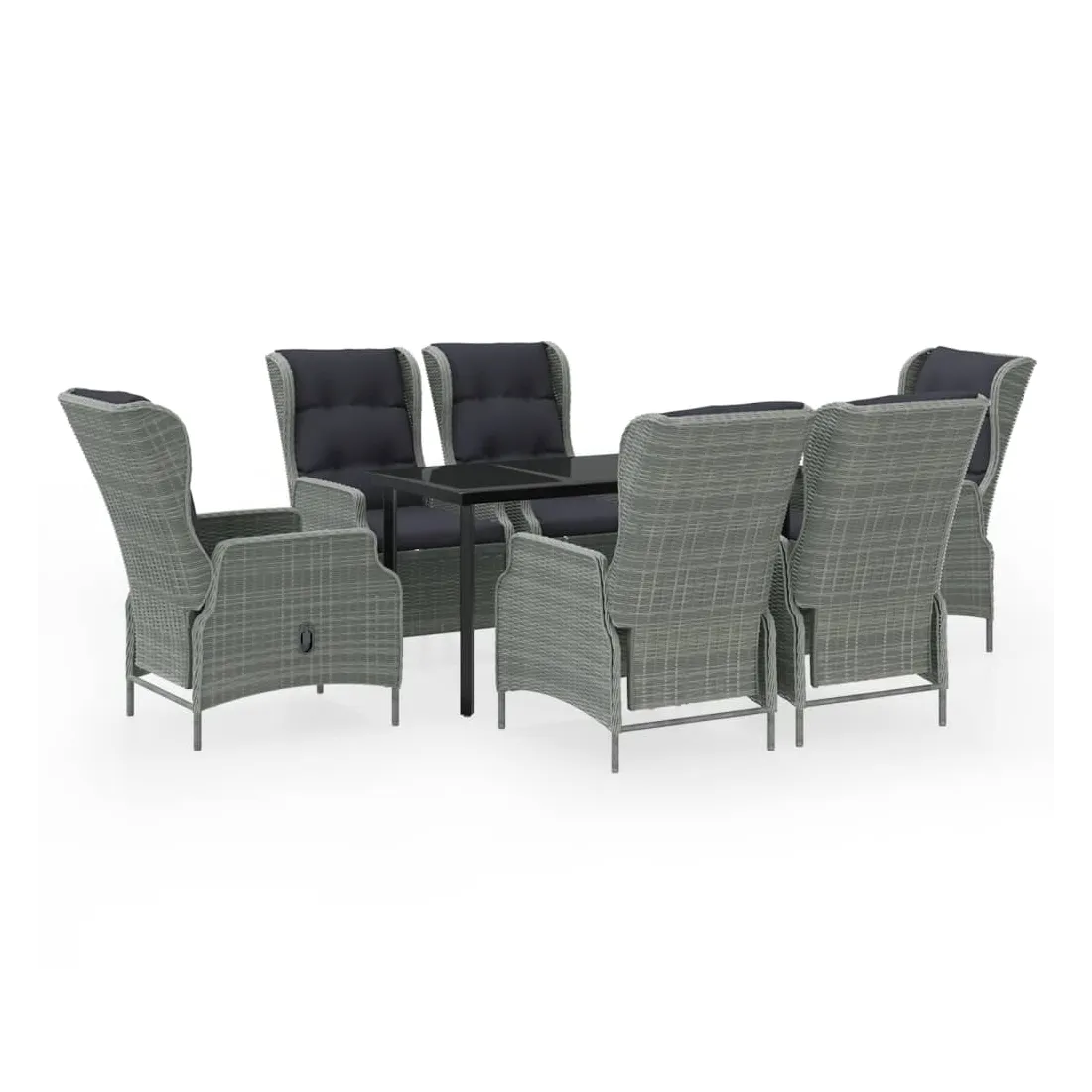 Profitez d'un bon repas ou d'un thé l'après-midi dans votre espace extérieur avec cet ensemble de salle à manger de jardin ! Ayant un design élégant, il deviendra le point central de votre jardin et de votre terrasse ! Cet ensemble de salle à manger d'extérieur pratique est doté d'un cadre en acier, ce qui le rend solide et robuste. Les chaises inclinables de jardin sont fabriquées en résine tressée résistante à l'eau et sans entretien, ce qui les rend parfaites pour une utilisation en extérieur. Les coussins bien rembourrés ajoutent un confort supplémentaire à vos repas. Les housses des coussins sont équipées d'une fermeture éclair et sont amovibles et lavables. Grâce au mécanisme de levage à gaz, le dossier est également réglable pour s'adapter à vos positions. En touchant le bouton sur le côté, le dossier peut s'incliner, pour une position confortable. En outre, le dessus de table en verre lisse est facile à nettoyer à l'aide d'un chiffon humide et est excellent pour placer des repas, des boissons et d'autres objets décoratifs. Remarque : afin de prolonger la durée de vie des meubles d'extérieur, nous vous recommandons de les protéger avec une housse imperméable.
