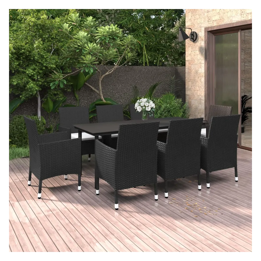Cet ensemble élégant de salle à manger de jardin vous permet de passer des moments agréables et confortables avec votre famille et vos amis. Le cadre en acier enduit de poudre rend la table et les chaises robustes et durables. Fabriquées en résine tressée résistante aux intempéries et imperméable, les chaises sont faciles à nettoyer, résistantes à l'usure et adaptées à un usage quotidien. Le dessus de table en verre lisse est idéal pour poser des boissons, de la nourriture ou des objets décoratifs. De plus, le coussin de siège bien rembourré ajoute un confort supplémentaire aux chaises. Remarque : afin de prolonger la durée de vie des meubles d'extérieur, nous vous recommandons de les protéger avec une housse imperméable.