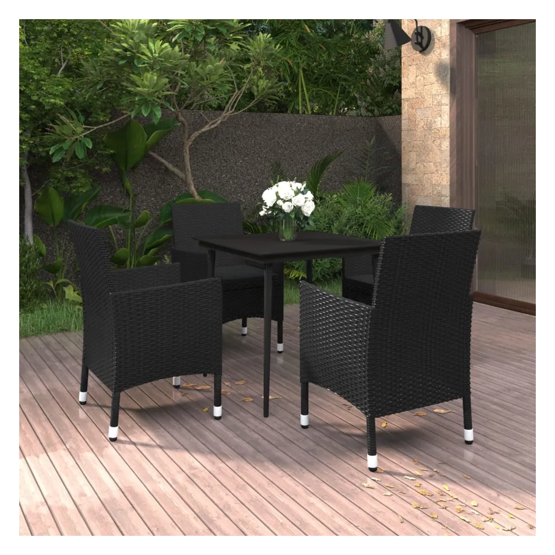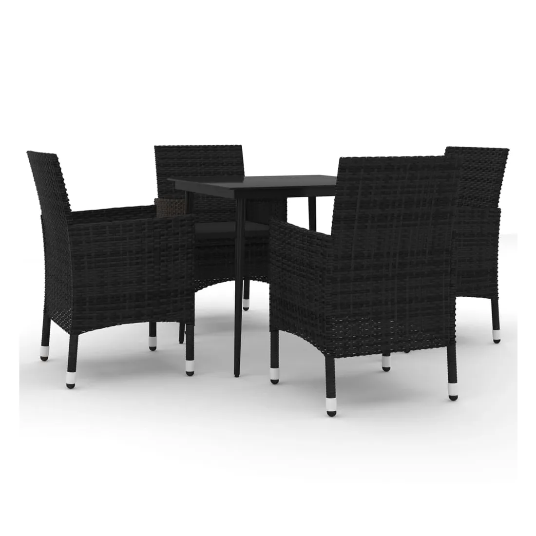 Cet ensemble élégant de salle à manger de jardin vous permet de passer des moments agréables et confortables avec votre famille et vos amis. Le cadre en acier enduit de poudre rend la table et les chaises robustes et durables. Fabriquées en résine tressée résistante aux intempéries et imperméable, les chaises sont faciles à nettoyer, résistantes à l'usure et adaptées à un usage quotidien. Le dessus de table en verre lisse est idéal pour poser des boissons, de la nourriture ou des objets décoratifs. De plus, le coussin de siège bien rembourré ajoute un confort supplémentaire aux chaises. Remarque : afin de prolonger la durée de vie des meubles d'extérieur, nous vous recommandons de les protéger avec une housse imperméable.