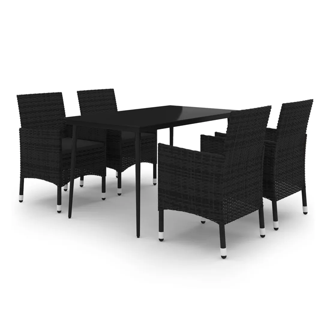 Cet ensemble élégant de salle à manger de jardin vous permet de passer des moments agréables et confortables avec votre famille et vos amis. Le cadre en acier enduit de poudre rend la table et les chaises robustes et durables. Fabriquées en résine tressée résistante aux intempéries et imperméable, les chaises sont faciles à nettoyer, résistantes à l'usure et adaptées à un usage quotidien. Le dessus de table en verre lisse est idéal pour poser des boissons, de la nourriture ou des objets décoratifs. De plus, le coussin de siège bien rembourré ajoute un confort supplémentaire aux chaises. Remarque : afin de prolonger la durée de vie des meubles d'extérieur, nous vous recommandons de les protéger avec une housse imperméable.