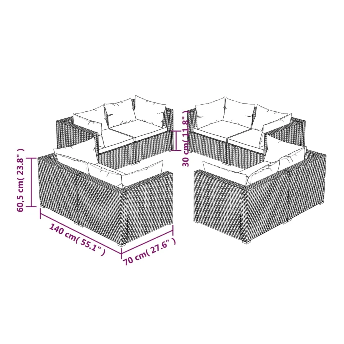 - Dimensions du canapé d'angle (chacun) : 70 x 70 x 60,5 cm (L x l x H)