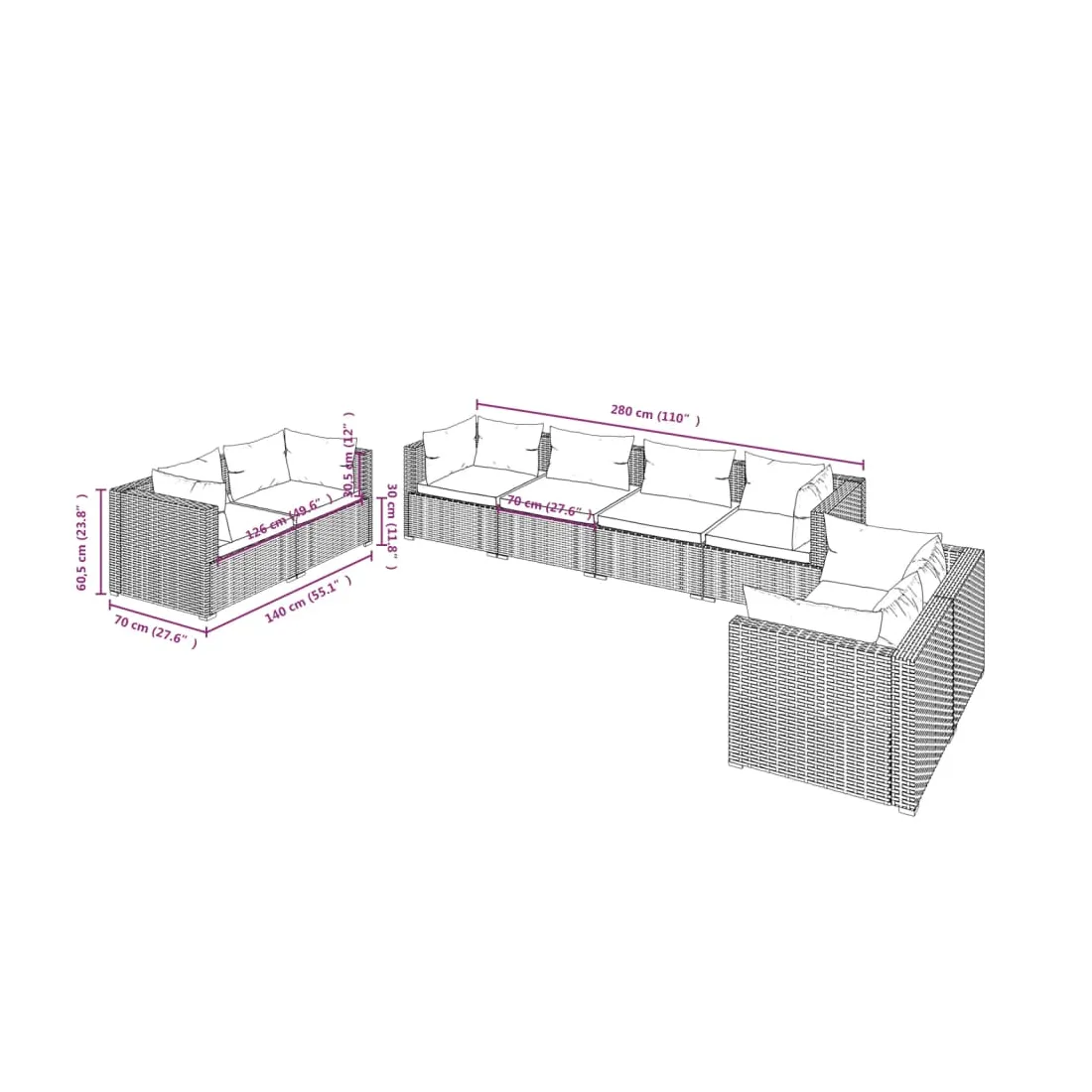Profitez de votre temps de détente sur cet ensemble de salon de jardin tendance ! Il peut répondre à une variété de besoins différents. Cadre robuste : cet ensemble de meubles de patio est doté d'un cadre solide en acier enduit de poudre et de pieds en plastique chromé, ce qui est très durable.Matériau haut de gamme : l'ensemble de canapés de jardin est conçu avec de la résine tressée résistante à l'eau, ce qui le rend facile à nettoyer, résistant à l'usure et adapté à une utilisation quotidienne à l'extérieur.Design modulaire : la conception modulaire permet de placer l'ensemble dans n'importe quelle disposition ou de le combiner avec d'autres segments modulaires pour répondre à vos besoins.Confort d'assise accru : les coussins et les oreillers bien rembourrés et amovibles offrent un confort optimal pour votre expérience d'assise à l'extérieur. Remarque :Afin de prolonger la durée de vie de votre mobilier d'extérieur, nous vous recommandons de le protéger avec une housse imperméable.