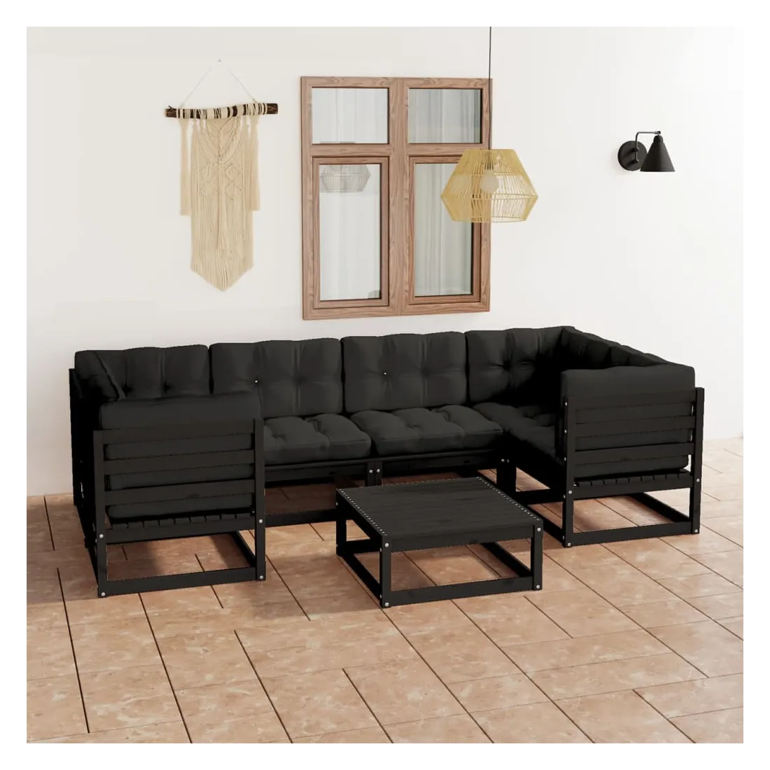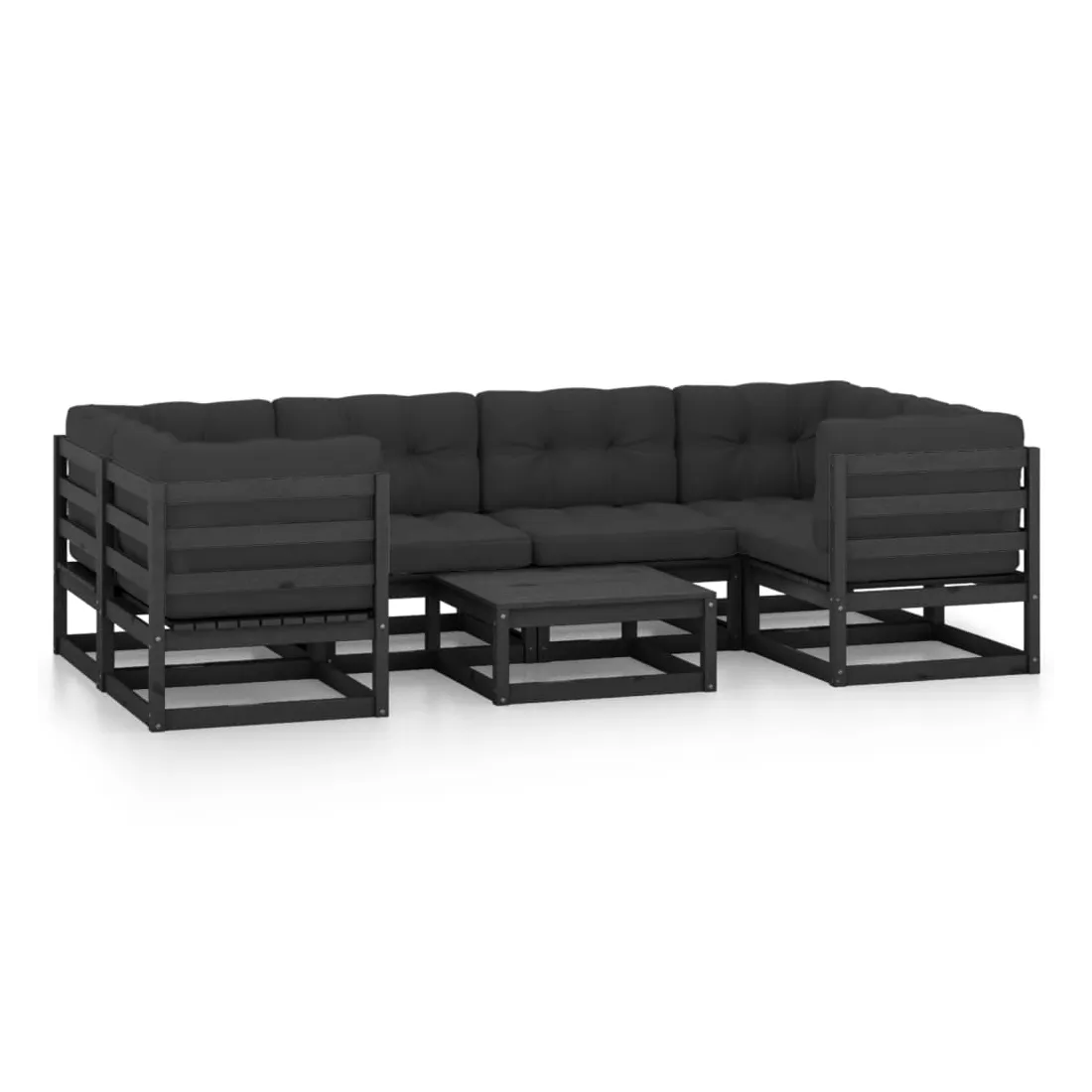 Salon de jardin 7 pcs avec coussins noir bois de pin massif