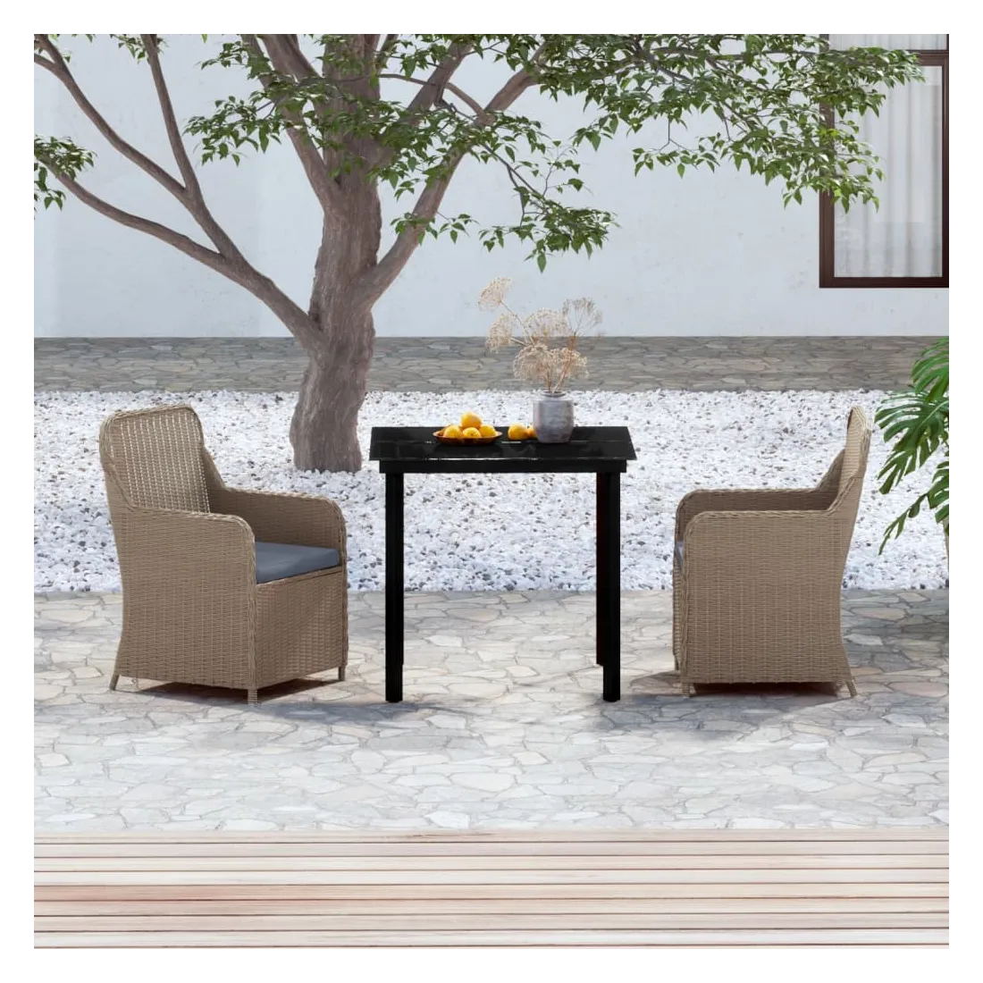 Cet élégant ensemble de salle à manger de jardin est destiné à être le point de mire de votre jardin ou patio ! C'est un excellent choix pour les repas en plein air ou pour vous détendre dans l'espace extérieur ! Les cadres en acier endui de poudre rendent la table et les chaises solides et stables pour une utilisation quotidienne en extérieur. Grâce à la résine tressée résistante à l'eau, les chaises sont faciles à nettoyer et résistantes à l'usure. La forme ergonomique et les coussins amovibles bien rembourrés en mousse offrent un confort d'assise optimal. Les housses de coussin en polyester, qui nécessitent peu d'entretien, peuvent être facilement retirées et lavées. En outre, le dessus de table en verre lisse est facile à nettoyer avec un chiffon humide et est parfait pour placer des repas, des boissons et d'autres objets décoratifs. Remarque : afin de prolonger la durée de vie des meubles d'extérieur, nous vous recommandons de les protéger avec une housse imperméable.