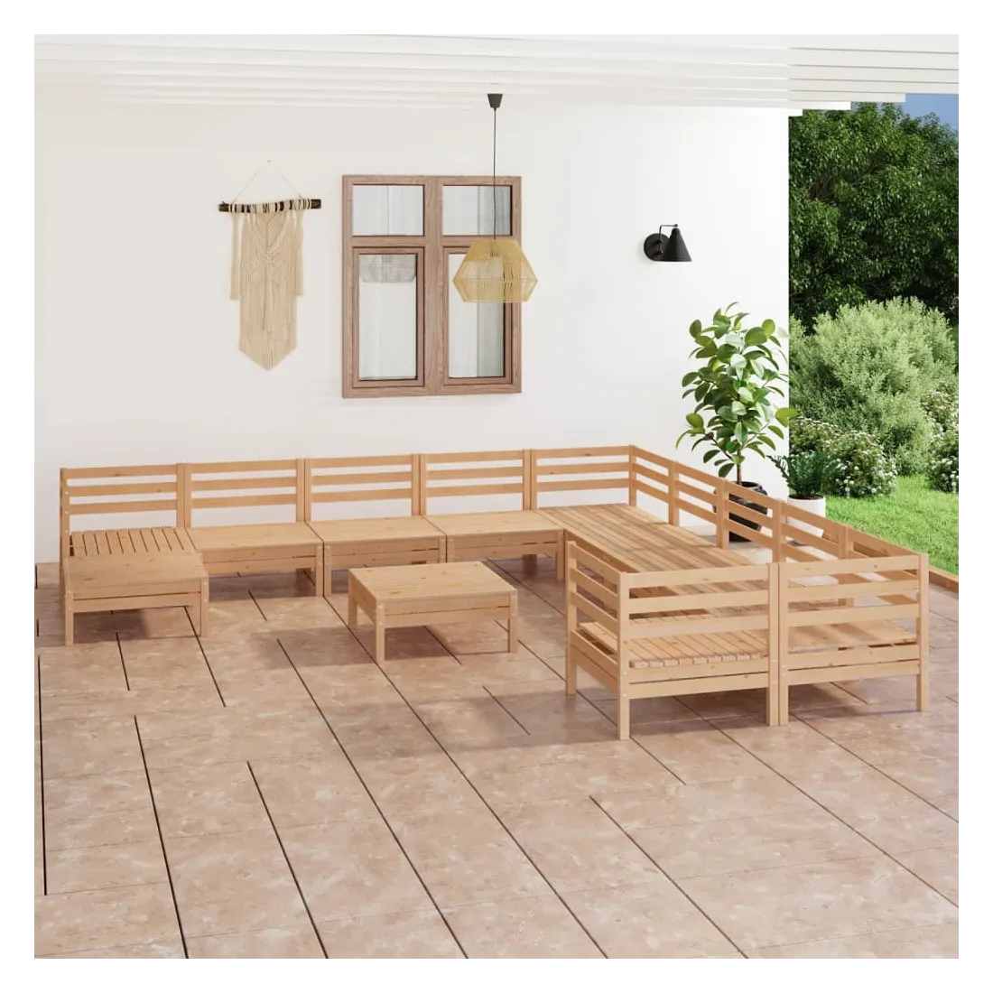 Cet ensemble de salon de jardin en bois est un choix idéal pour vous détendre, profiter du beau temps, faire une sieste ou discuter en famille ou entre amis. Avec son design intemporel de palette, l'ensemble de canapés en bois ajoute une touche de charme rustique à votre terrasse, jardin ou salon. Fabriqué en bois de pin massif, cet ensemble de salon de patio est très durable et résistant aux intempéries. Cet ensemble de meubles a une construction solide et nécessite peu d'entretien. De plus, la conception modulaire permet également de placer l'ensemble dans n'importe quel arrangement selon vos goûts. Remarque : afin de prolonger la durée de vie des meubles d'extérieur, nous vous recommandons de les protéger avec une housse imperméable.