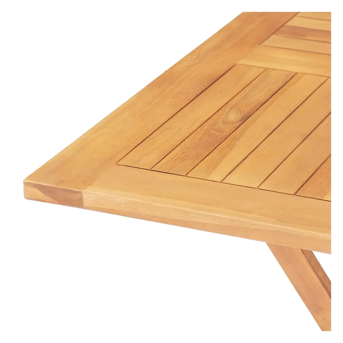 Détendez-vous et profitez d'un thé et de repas agréables avec votre famille et vos amis grâce à cet ensemble de salle à manger de jardin en bois classique ! Bois de teck massif : l'ensemble de salle à manger est fabriqué en bois de teck massif. Le bois de teck massif est un matériau naturel magnifique. Il a été chevronné, séché au four, puis sablé finement pour lui donner une apparence très lisse. Le bois de teck est connu pour sa résistance exceptionnelle et sa résistance aux intempéries.Fonction pliable : l'ensemble de salle à manger d'extérieur peut être plié pour économiser de l'espace lorsqu'il n'est pas utilisé.Expérience confortable : le dossier de la chaise de jardin vous offre un excellent soutien, offrant une expérience confortable optimale.Dessus de table robuste : le dessus de table robuste de la table à manger est parfait pour placer des repas, des boissons, des vases, des bols de fruits ou d'autres objets décoratifs.Trou pour parasol : le dessus de table est doté d'un trou pour parasol, ce qui vous permet de fixer facilement un parasol pour créer un coin ombragé.Design à lattes : la chaise à manger d'extérieur conçue avec un design à lattes est simple et intemporelle. Remarque :Pour que vos meubles d'extérieur restent beaux, nous vous recommandons de les protéger avec une housse imperméable.