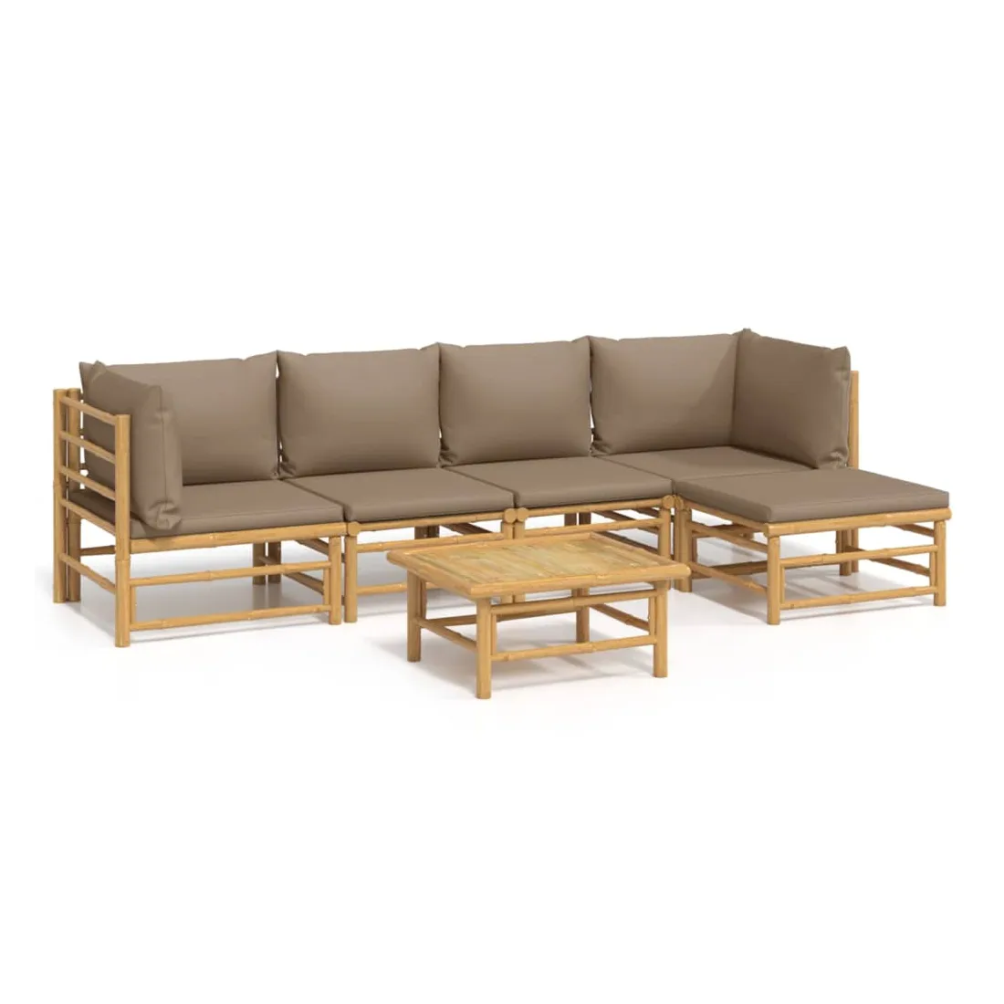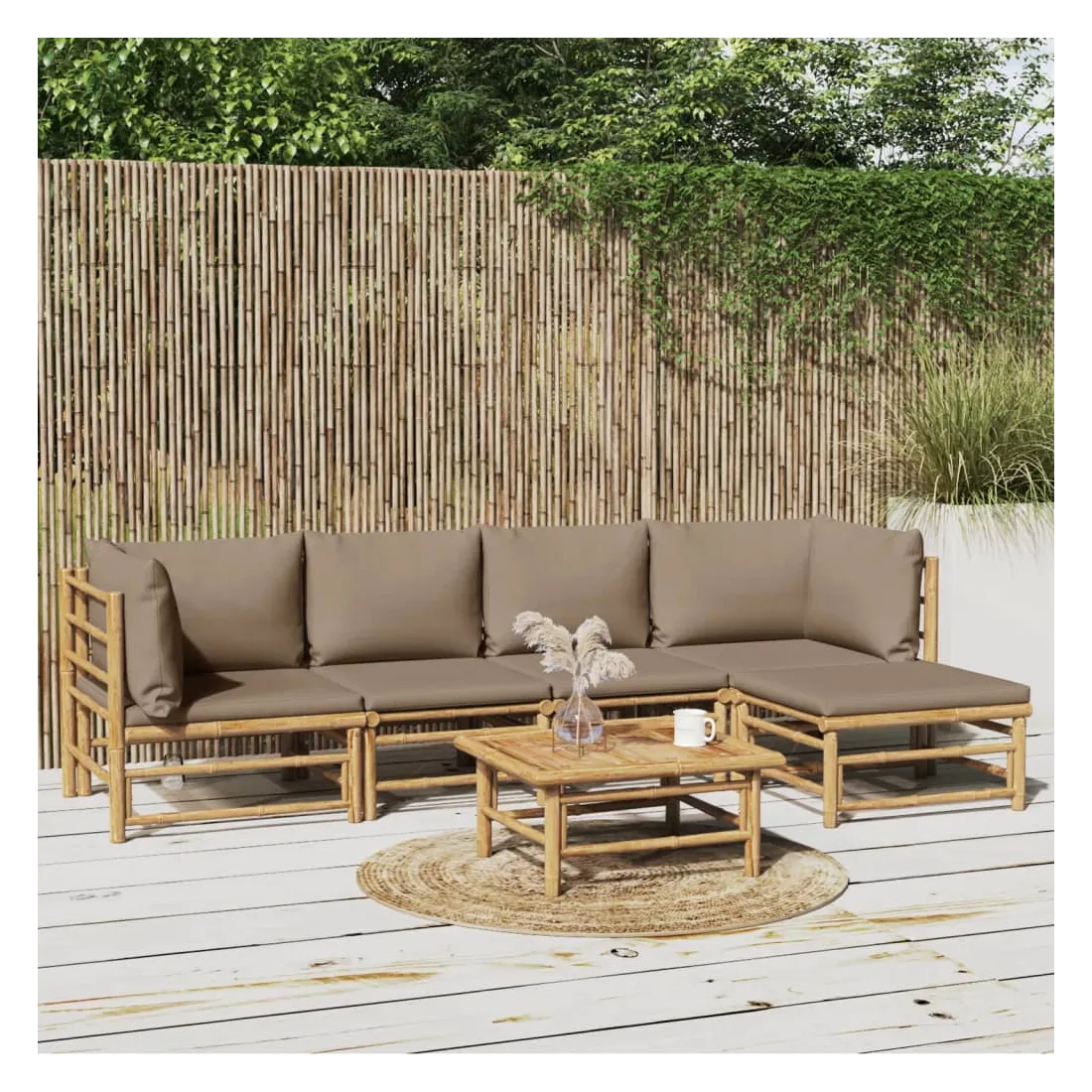 Savourez une tasse de café ou de thé par beau temps dans votre espace extérieur avec cet élégant ensemble de salon de jardin en bambou ! Matériau durable : le bambou est connu pour sa flexibilité et sa dureté. Les meubles en bambou sont une bonne option lorsque vous voulez des meubles d'extérieur solides fabriqués à partir de matériaux naturels.Expérience d'assise confortable : le dossier et l'accoudoir ajoutent un confort d'assise supplémentaire pour l'ensemble de canapé de jardin. De plus, les coussins d'assise et de dossier moelleux offrent un confort pendant votre temps d'assise.Table pratique : la table robuste est parfaite pour placer des repas, des boissons et d'autres objets décoratifs.Conception modulaire : l'ensemble de salon est flexible et facile à déplacer, vous pouvez donc le combiner avec d'autres segments modulaires dans la boutique en ligne pour créer vos propres configurations d'ensemble de salon d'extérieur ! Remarque :Pour que vos meubles d'extérieur restent beaux, nous vous recommandons de les protéger avec une housse imperméable.Bon à savoir :Pour faciliter au maximum le montage, chaque produit est livré avec des instructions.