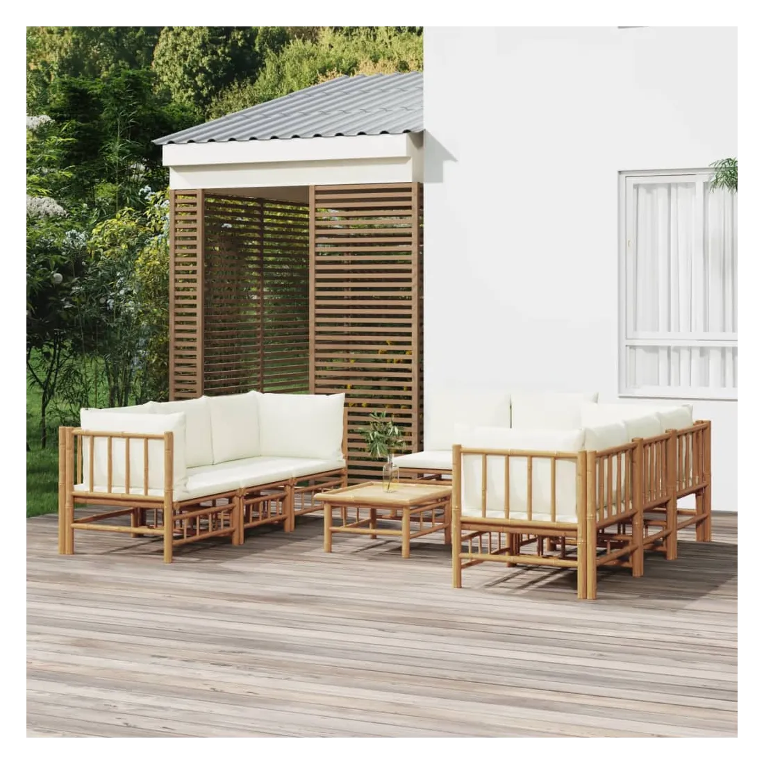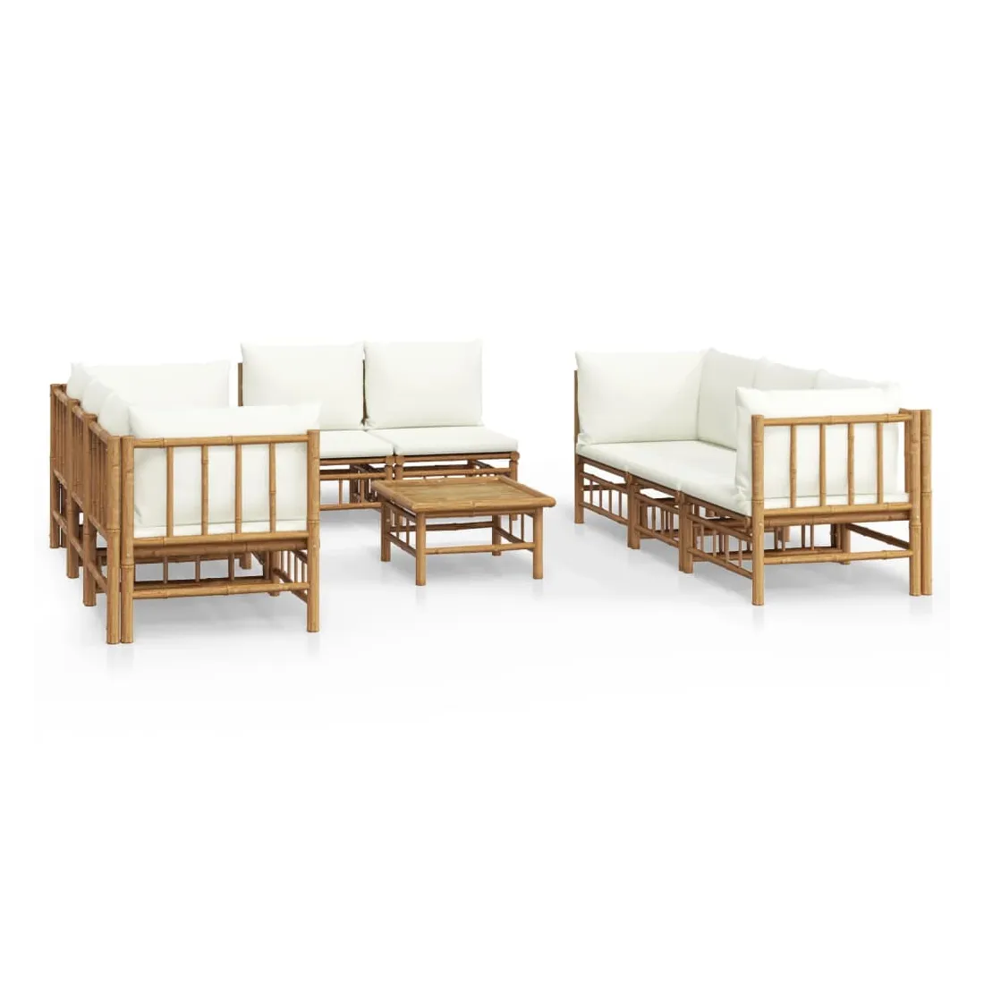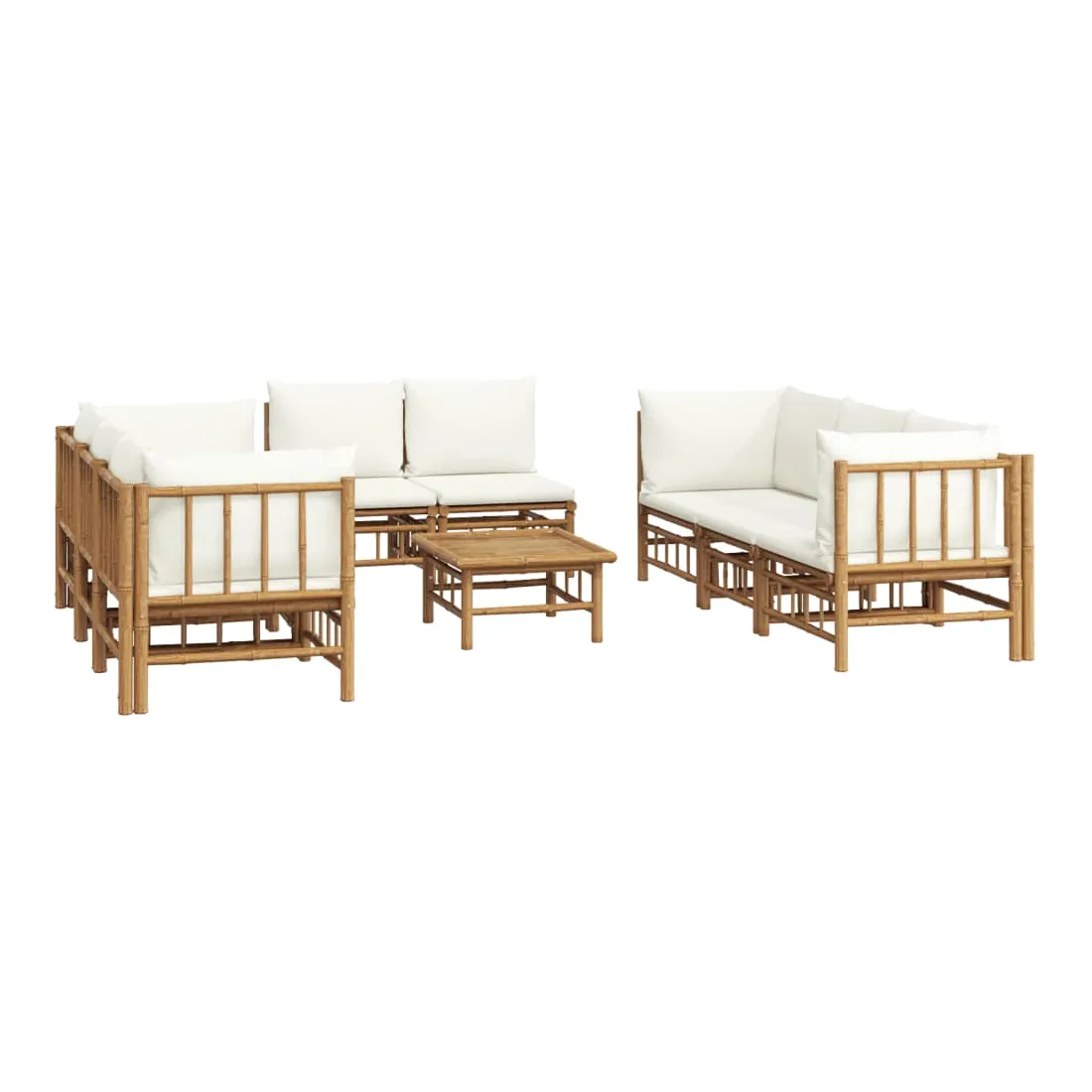 Salon de jardin 9 pcs avec coussins blanc crème bambou