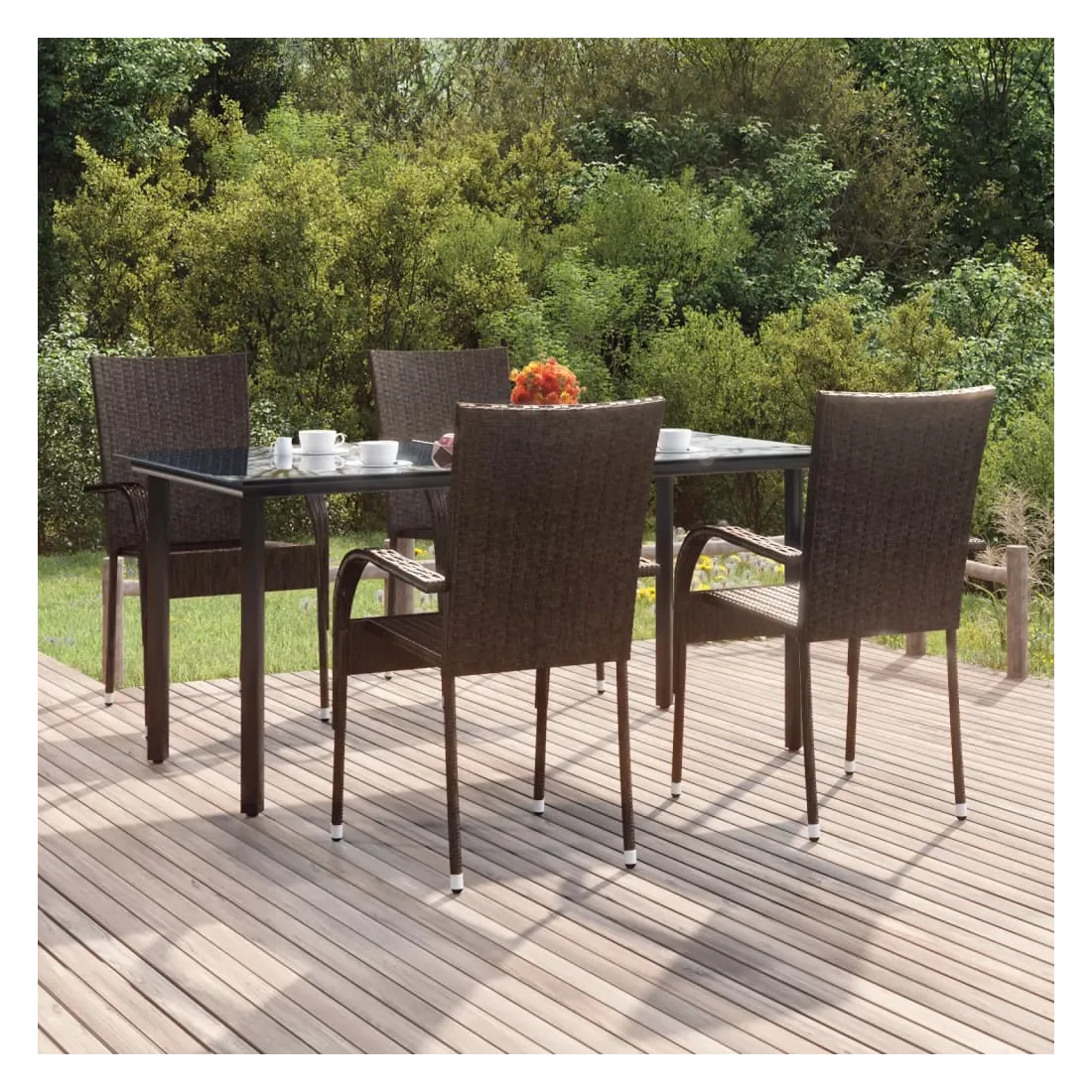 Cet ensemble de salle à manger de jardin est un excellent choix pour manger ou vous détendre dans l'espace extérieur ! Matériau durable : la résine tressée, également connue sous le nom de rotin poly, résiste aux intempéries et est facile à nettoyer. Elle reste belle à l'extérieur pendant une longue période. Elle offre une excellente qualité, commodité et un aspect esthétique.Cadre robuste : les cadres en acier enduit de poudre rendent l'ensemble de salle à manger d'extérieur robuste et stable pour une utilisation quotidienne à l'extérieur.Dessus de table pratique : le dessus lisse de la table de salle à manger est en verre trempé, facile à nettoyer avec un chiffon humide. De plus, le dessus robuste est parfait pour placer des repas, des boissons et d'autres objets décoratifs.Conception flexible : grâce à leur construction légère, ces chaises d'extérieur sont faciles à déplacer et peuvent être empilées pour économiser de l'espace lorsqu'elles ne sont pas utilisées. Remarque :Afin de prolonger la durée de vie de votre mobilier d'extérieur, nous vous recommandons de le protéger avec une housse imperméable.Chaque produit est livré avec un manuel de montage dans la boîte pour un montage facile.