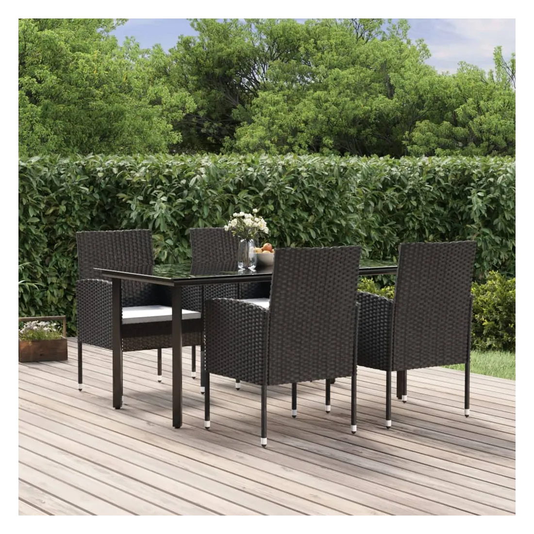 Profitez d'un bon repas ou d'un thé l'après-midi dans votre espace extérieur avec cet ensemble de salle à manger de jardin ! Matériau résistant aux intempéries : la résine tressée, également connue sous le nom de rotin poly, résiste aux intempéries et est facile à nettoyer. Elle reste belle à l'extérieur pendant une longue période. Elle offre une excellente qualité, commodité et un aspect esthétique.Cadre robuste : les cadres en acier enduit de poudre rendent l'ensemble de salle à manger d'extérieur robuste et stable pour une utilisation quotidienne à l'extérieur.Dessus de table pratique : le dessus lisse de la table de salle à manger est en verre trempé, facile à nettoyer avec un chiffon humide. De plus, le dessus robuste est parfait pour placer des repas, des boissons et d'autres objets décoratifs.Design confortable : conçues avec des dossiers et des accoudoirs incurvés, ces chaises d'extérieur offrent un maximum de confort.Confort supplémentaire : les coussins bien rembourrés offrent un confort ultime pendant votre temps d'assise. Remarque :Afin de prolonger la durée de vie de votre mobilier d'extérieur, nous vous recommandons de le protéger avec une housse imperméable.Chaque produit est livré avec un manuel de montage dans la boîte pour un montage facile.