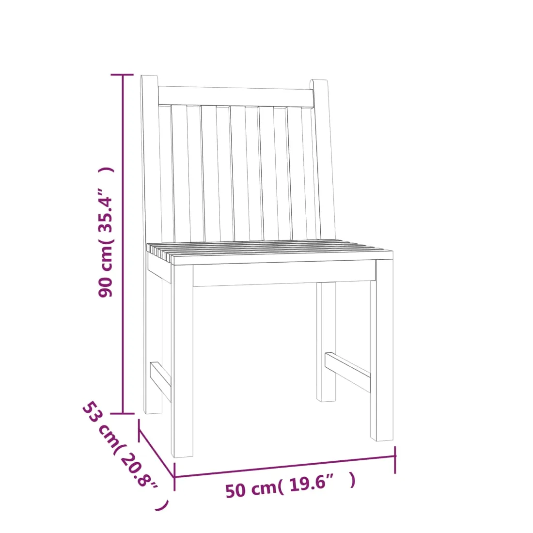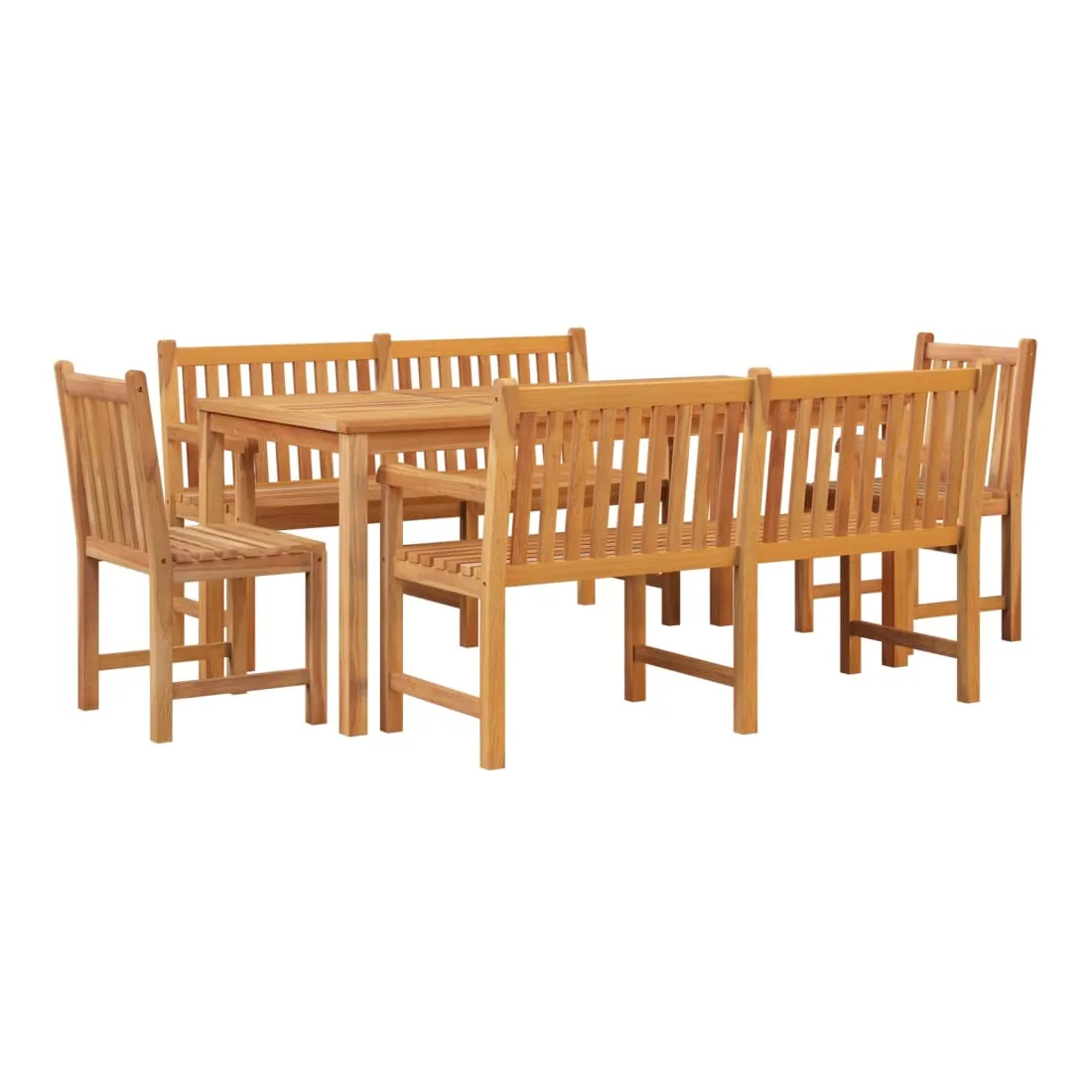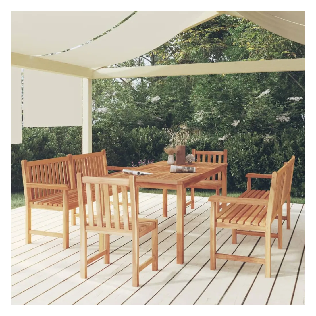 vidaXLCet ensemble de salle à manger de jardin en bois, au design élégant et contemporain, est un excellent choix pour manger ou vous détendre dans le jardin. Bois de teck massif : le bois de teck massif est un matériau naturel magnifique. Il a été chevronné, séché au four, puis sablé finement pour lui donner une apparence très lisse. Le bois de teck est connu pour sa résistance exceptionnelle et sa résistance aux intempéries.Dessus de table robuste : cette table de repas vous offre un dessus de table robuste. Vous pouvez y placer vos collations, tes boissons et toutes vos décorations préférées.Caractéristique résistante à l'eau : grâce à sa caractéristique de résistance à l'eau et à son look classique, vous pouvez placer l'ensemble de meubles de jardin n'importe où autour de votre maison, que ce soit à l'intérieur ou à l'extérieur !Expérience d'assise confortable : chaque banc et chaise de dîner est doté d'un dossier, ce qui rend l'assise très confortable. Remarque :Chaque produit est livré avec un manuel de montage dans la boîte pour un montage facile.Afin de prolonger la durée de vie de votre mobilier d'extérieur, nous vous recommandons de le protéger avec une housse imperméable.