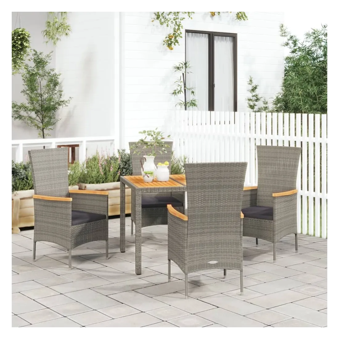 Cet ensemble de salle à manger de jardin tendance, au design élégant et contemporain, est un excellent choix pour manger ou vous détendre dans votre jardin. Matériau résistant aux intempéries : la résine tressée, également connue sous le nom de rotin poly, résiste aux intempéries et est facile à nettoyer. Elle reste belle à l'extérieur pendant une longue période. Elle offre une excellente qualité, commodité et un aspect esthétique.Cadre robuste : les cadres en acier enduit de poudre rendent l'ensemble de salle à manger d'extérieur robuste et stable pour une utilisation quotidienne à l'extérieur.Dessus de table pratique : le dessus de table robuste est parfait pour placer des repas, des boissons et d'autres objets décoratifs.Conception modulaire : l'ensemble de salle à manger de jardin est flexible et facile à déplacer, vous pouvez donc le combiner avec d'autres segments modulaires dans la boutique en ligne pour créer vos propres configurations d'ensemble de salle à manger de jardin !Expérience d'assise confortable : les coussins bien rembourrés offrent du confort pour votre temps d'assise. Bon à savoir :Pour faciliter au maximum le montage, chaque produit est livré avec des instructions. Remarque :Pour que vos meubles d'extérieur restent beaux, nous vous recommandons de les protéger avec une housse imperméable.