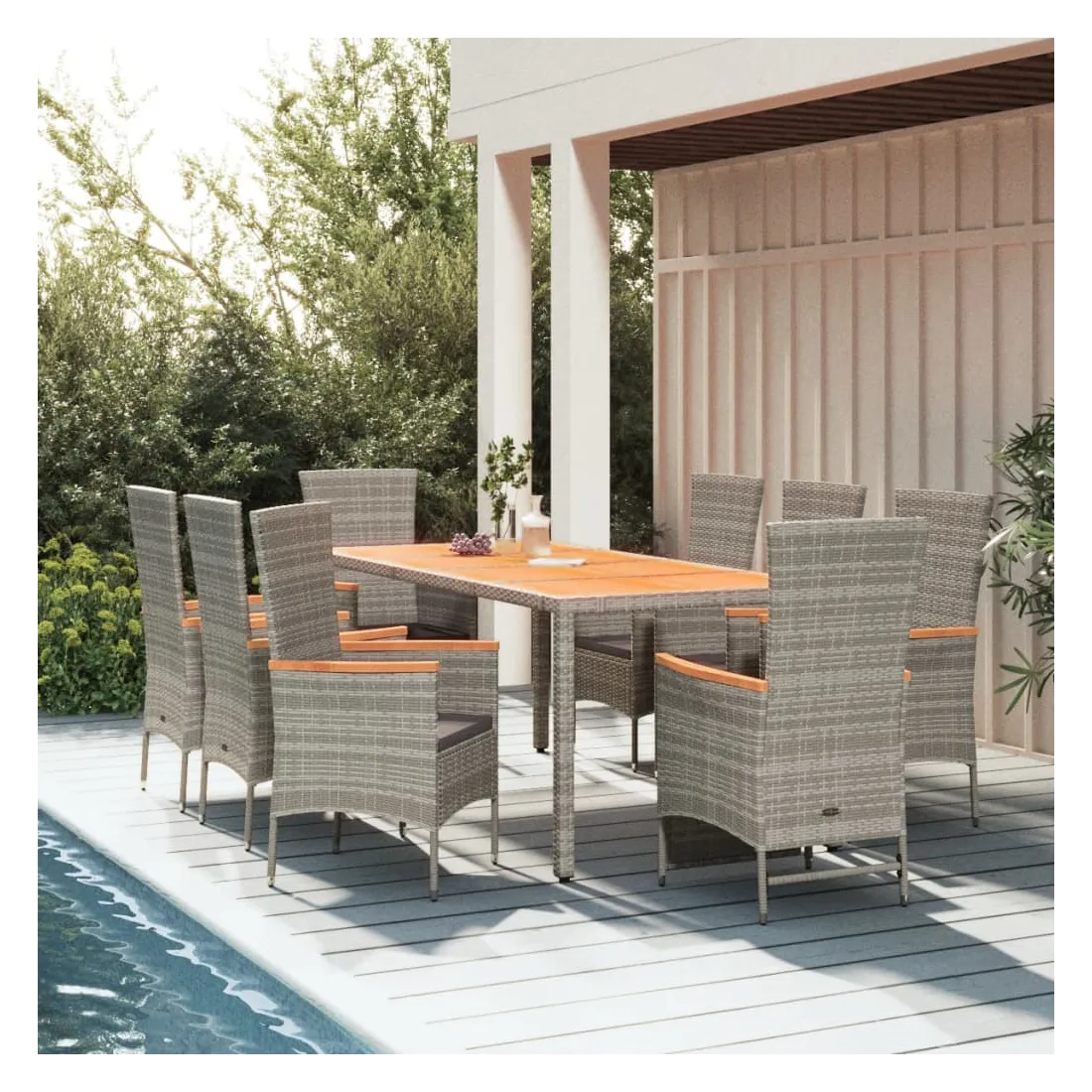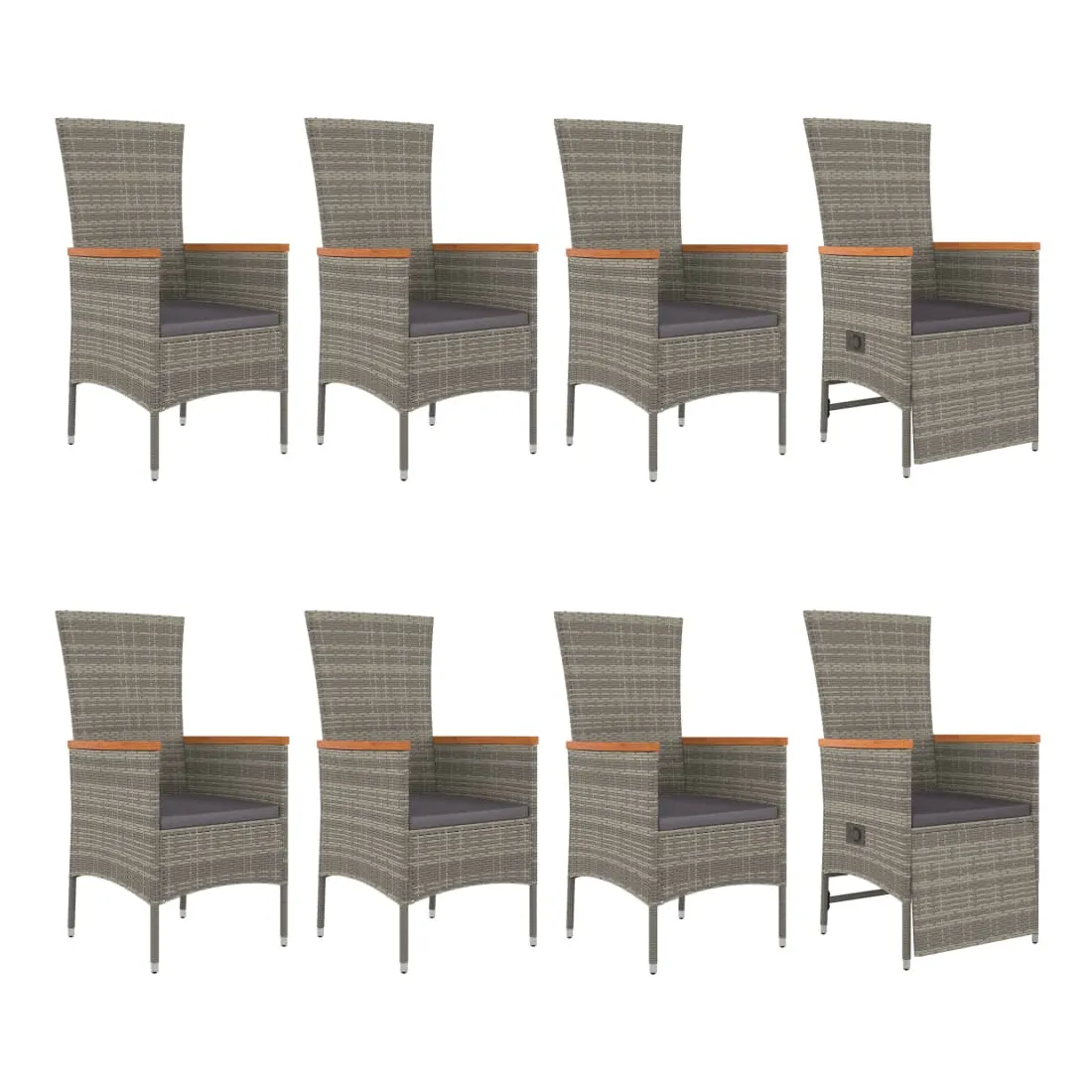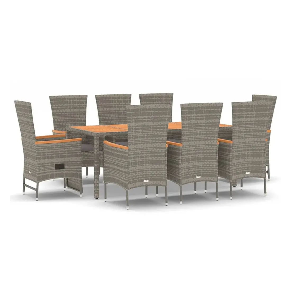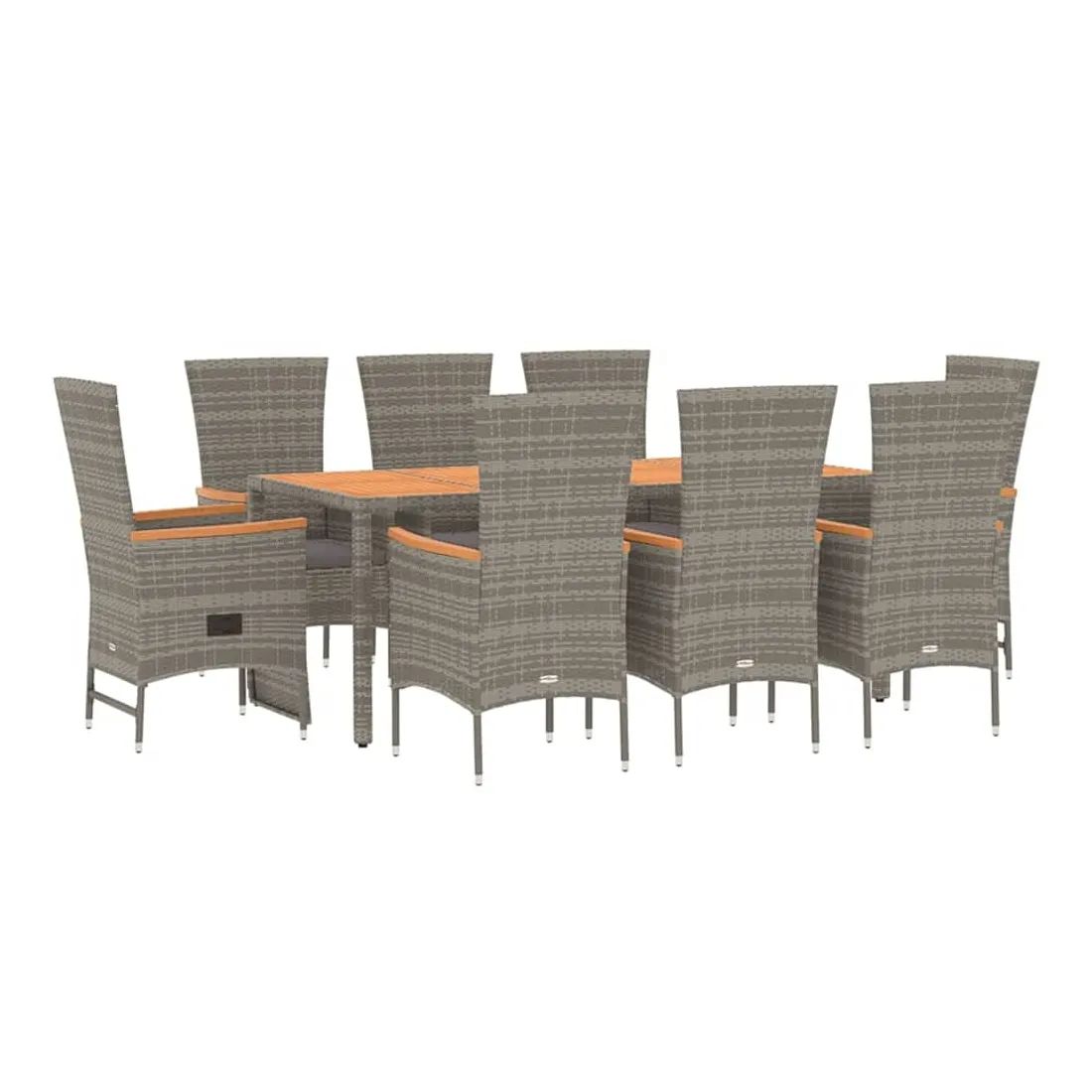 Cet ensemble de salle à manger de jardin tendance, au design élégant et contemporain, est un excellent choix pour manger ou vous détendre dans votre jardin. Matériau résistant aux intempéries : la résine tressée, également connue sous le nom de rotin poly, résiste aux intempéries et est facile à nettoyer. Elle reste belle à l'extérieur pendant une longue période. Elle offre une excellente qualité, commodité et un aspect esthétique.Cadre robuste : les cadres en acier enduit de poudre rendent l'ensemble de salle à manger d'extérieur robuste et stable pour une utilisation quotidienne à l'extérieur.Dessus de table pratique : le dessus de table robuste est parfait pour placer des repas, des boissons et d'autres objets décoratifs.Conception modulaire : l'ensemble de salle à manger de jardin est flexible et facile à déplacer, vous pouvez donc le combiner avec d'autres segments modulaires dans la boutique en ligne pour créer vos propres configurations d'ensemble de salle à manger de jardin !Fonction d'inclinaison : les chaises de jardin sont spécialement conçues avec une fonction d'inclinaison afin que vous puissiez régler le dossier et le repose-pied selon votre confort.Expérience d'assise confortable : les coussins bien rembourrés offrent du confort pour votre temps d'assise. Bon à savoir :Pour faciliter au maximum le montage, chaque produit est livré avec des instructions. Remarque :Pour que vos meubles d'extérieur restent beaux, nous vous recommandons de les protéger avec une housse imperméable.