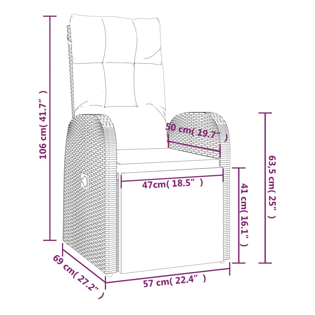 - Dimensions de l'assise : 57 x 69 x 106 cm (l x P x H)