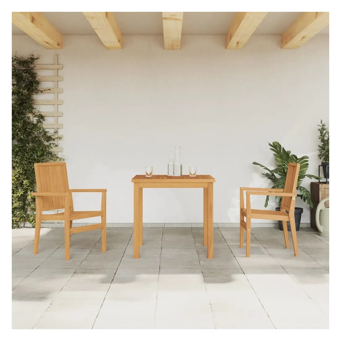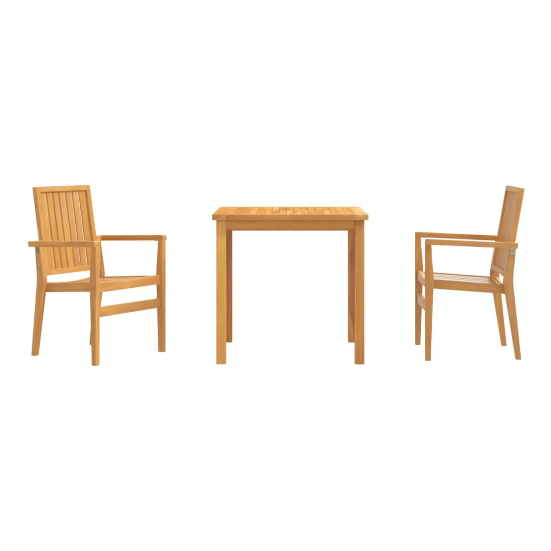 Profitez d'un bon repas ou d'un thé l'après-midi dans votre espace extérieur avec cet ensemble à manger de jardin en bois ! Bois de teck massif : le bois de teck massif est un matériau naturel magnifique. Il a été chevronné, séché au four, puis sablé finement pour lui donner une apparence très lisse. Le bois de teck est connu pour sa résistance exceptionnelle et sa résistance aux intempéries.Dessus de table pratique : le dessus de table robuste de la table à manger permet de placer des collations, des paniers de fruits, des objets décoratifs et d'autres objets nécessaires.Assise confortable : le dossier et les accoudoirs assurent une assise confortable à votre fauteuil de jardin.Fonction empilable : la chaise à manger est empilable pour économiser de l'espace lorsqu'elle n'est pas utilisée.Surface facile à nettoyer : la surface lisse rend l'ensemble de meubles de jardin facile à nettoyer avec un chiffon humide. Bon à savoir :Pour que vos meubles d'extérieur restent beaux, nous vous recommandons de les protéger avec une housse imperméable.