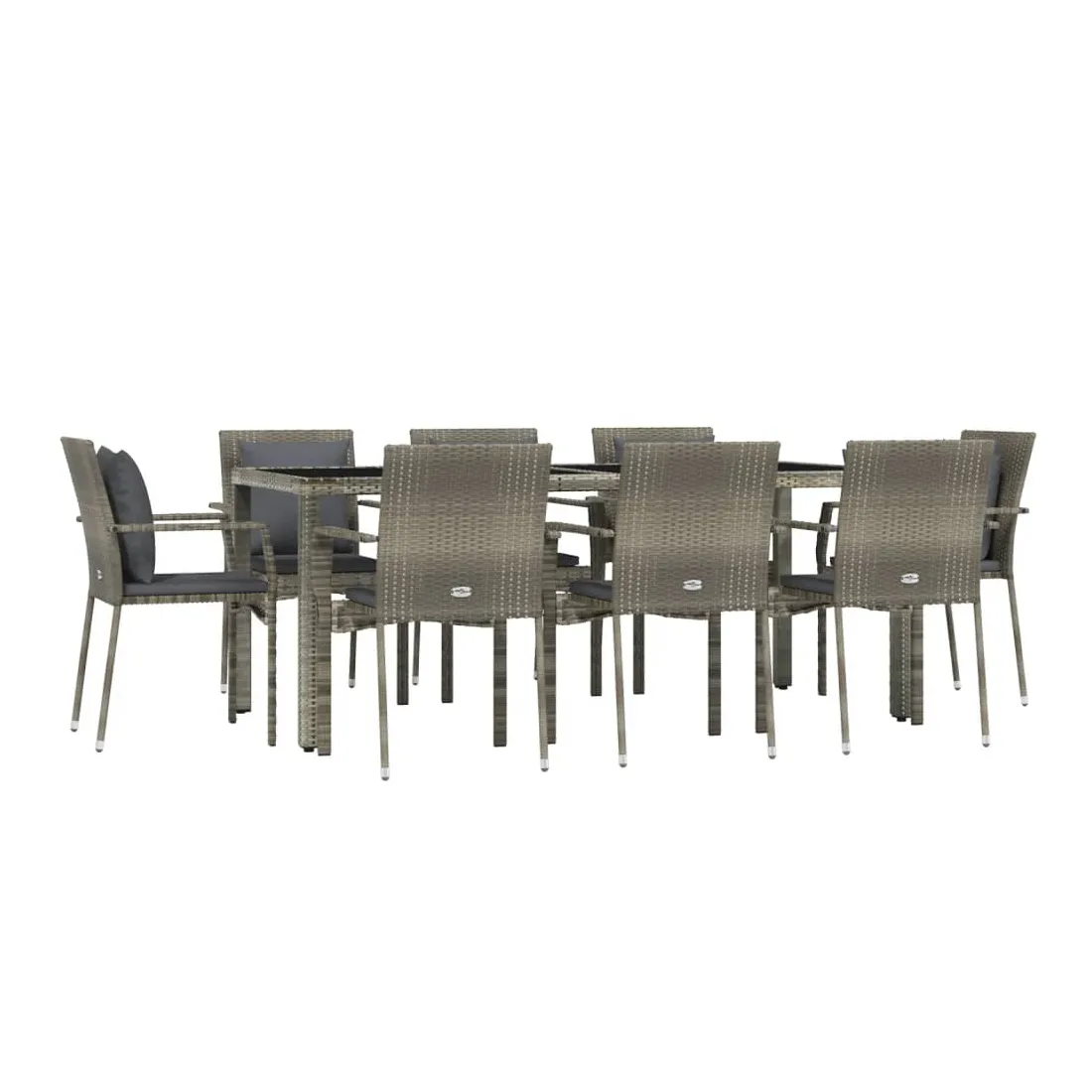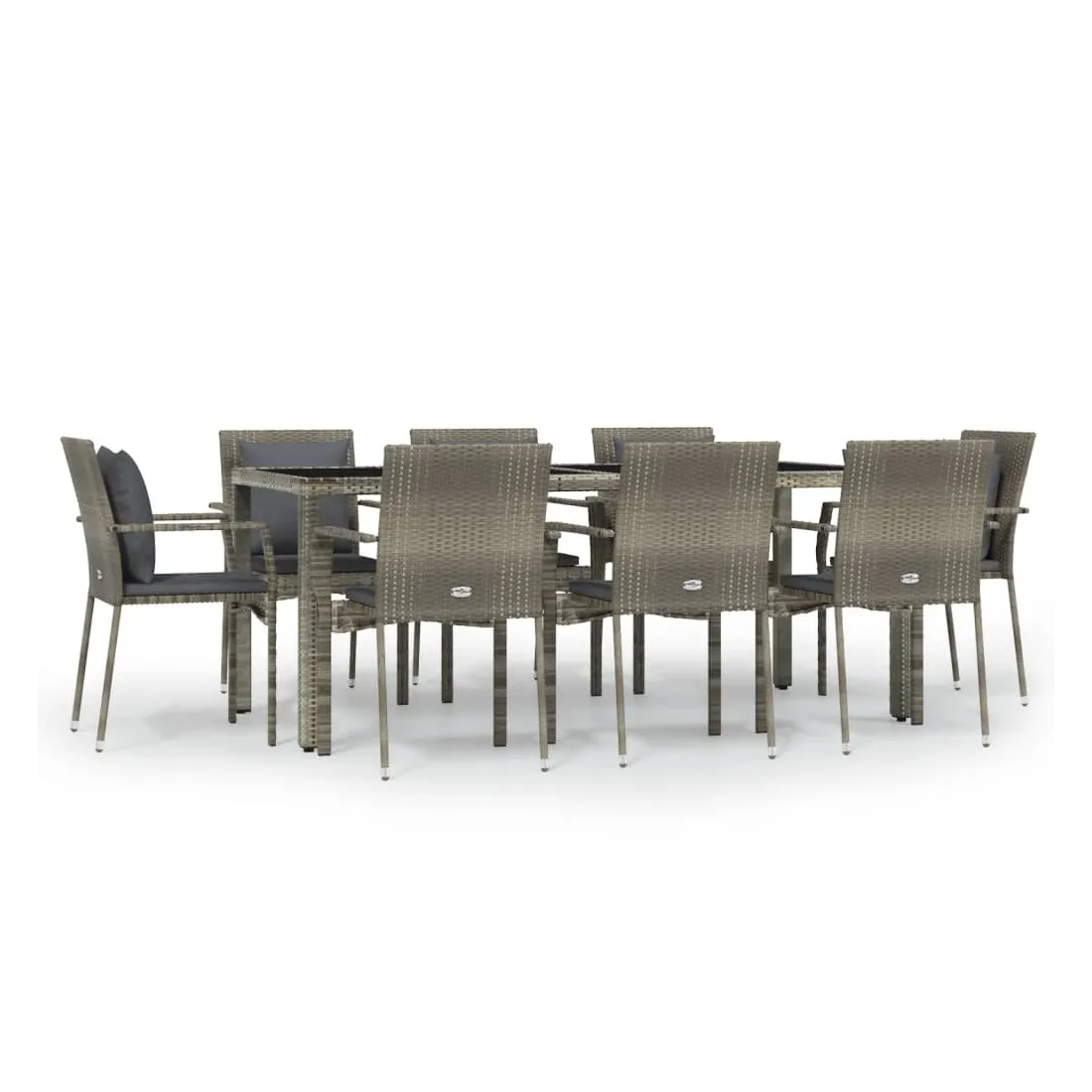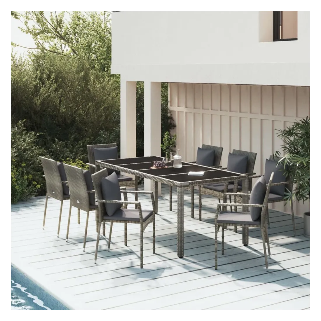 Cet ensemble de salle à manger de jardin tendance, au design élégant et contemporain, est un excellent choix pour manger ou vous détendre dans votre jardin. Matériau résistant aux intempéries : la résine tressée, également connue sous le nom de rotin poly, résiste aux intempéries et est facile à nettoyer. Elle reste belle à l'extérieur pendant une longue période. Elle offre une excellente qualité, commodité et un aspect esthétique.Cadre robuste : les cadres en acier enduit de poudre rendent l'ensemble de salle à manger d'extérieur robuste et stable pour une utilisation quotidienne à l'extérieur.Dessus de table pratique : le dessus lisse de la table de jardin est en verre trempé, facile à nettoyer avec un chiffon humide. De plus, le dessus robuste est parfait pour placer des repas, des boissons et d'autres objets décoratifs.Conception modulaire : l'ensemble de salle à manger de jardin est flexible et facile à déplacer, vous pouvez donc le combiner avec d'autres segments modulaires dans la boutique en ligne pour créer vos propres configurations d'ensemble de salle à manger de jardin !Expérience d'assise confortable : le dossier ajoute un confort d'assise supplémentaire à la chaise de jardin. De plus, les coussins bien rembourrés vous permettent de vous asseoir confortablement. Bon à savoir :Pour faciliter au maximum le montage, chaque produit est livré avec des instructions. Remarque :Pour que vos meubles d'extérieur restent beaux, nous vous recommandons de les protéger avec une housse imperméable.