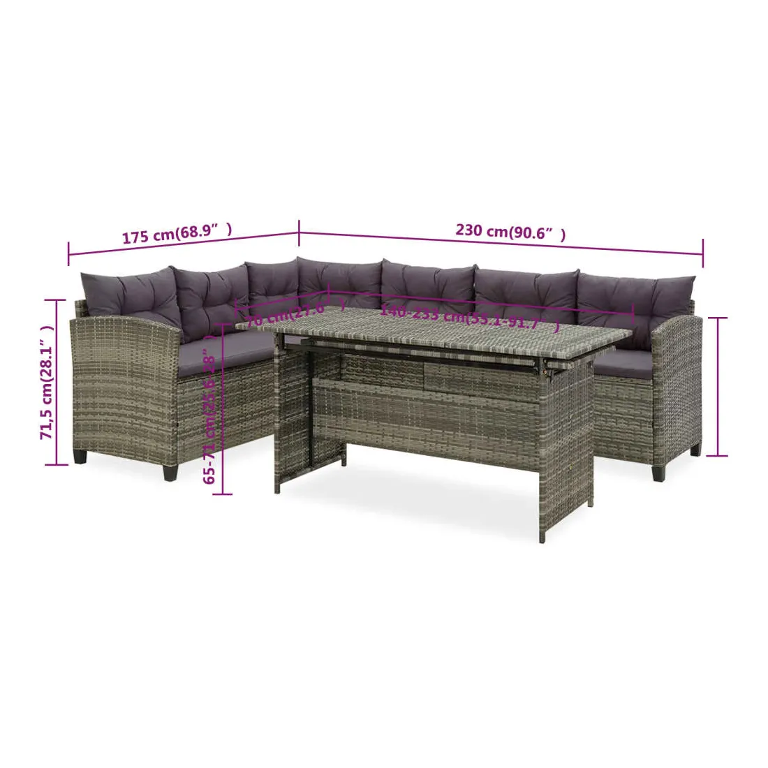 - Dimensions du canapé : 230 x 175 x 71,5 cm (l x P x H)
