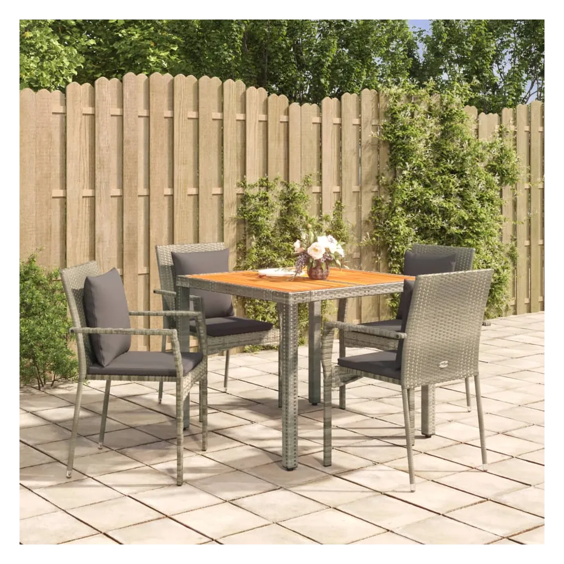 vidaXLCet ensemble de salle à manger de jardin tendance, au design élégant et contemporain, est un excellent choix pour manger ou vous détendre dans votre jardin. Matériau résistant aux intempéries : la résine tressée, également connue sous le nom de rotin poly, résiste aux intempéries et est facile à nettoyer. Elle reste belle à l'extérieur pendant une longue période. Elle offre une excellente qualité, commodité et un aspect esthétique.Cadre robuste : les cadres en acier enduit de poudre rendent l'ensemble de salle à manger d'extérieur robuste et stable pour une utilisation quotidienne à l'extérieur.Dessus de table pratique : le dessus de table en bois d'acacia massif est parfait pour placer des boissons, des aliments et des décorations. Il a une belle apparence et est facile à nettoyer.Conception modulaire : l'ensemble de salle à manger de jardin est flexible et facile à déplacer, vous pouvez donc le combiner avec d'autres segments modulaires dans la boutique en ligne pour créer vos propres configurations d'ensemble de salle à manger de jardin !Expérience d'assise confortable : le dossier ajoute un confort d'assise supplémentaire à la chaise de jardin. De plus, les coussins bien rembourrés vous permettent de vous asseoir confortablement. Bon à savoir :Pour faciliter au maximum le montage, chaque produit est livré avec des instructions. Remarque :Pour que vos meubles d'extérieur restent beaux, nous vous recommandons de les protéger avec une housse imperméable.