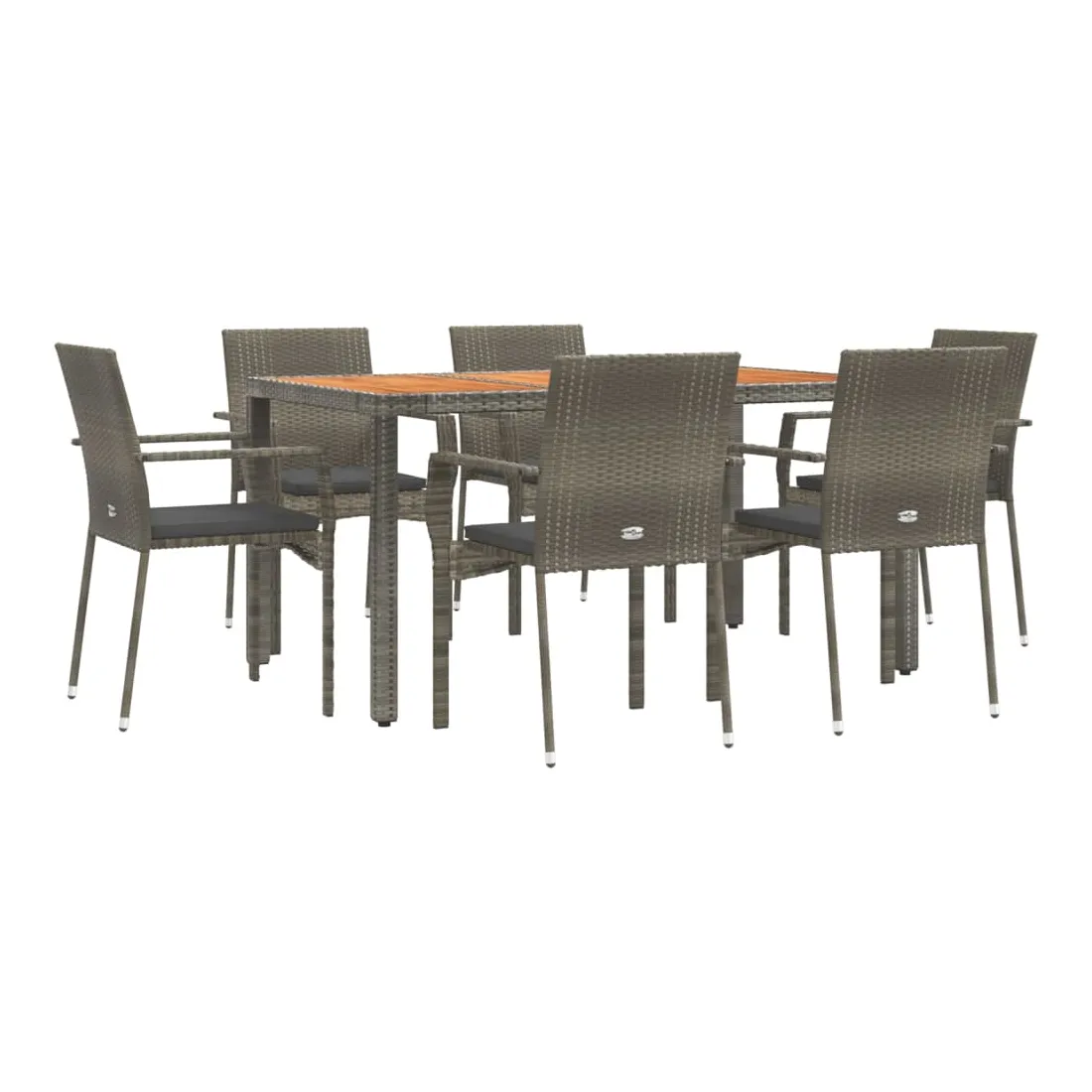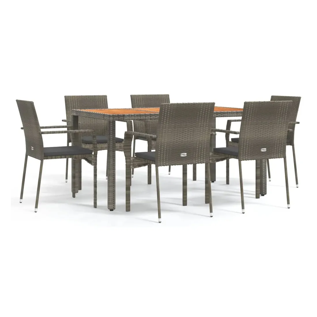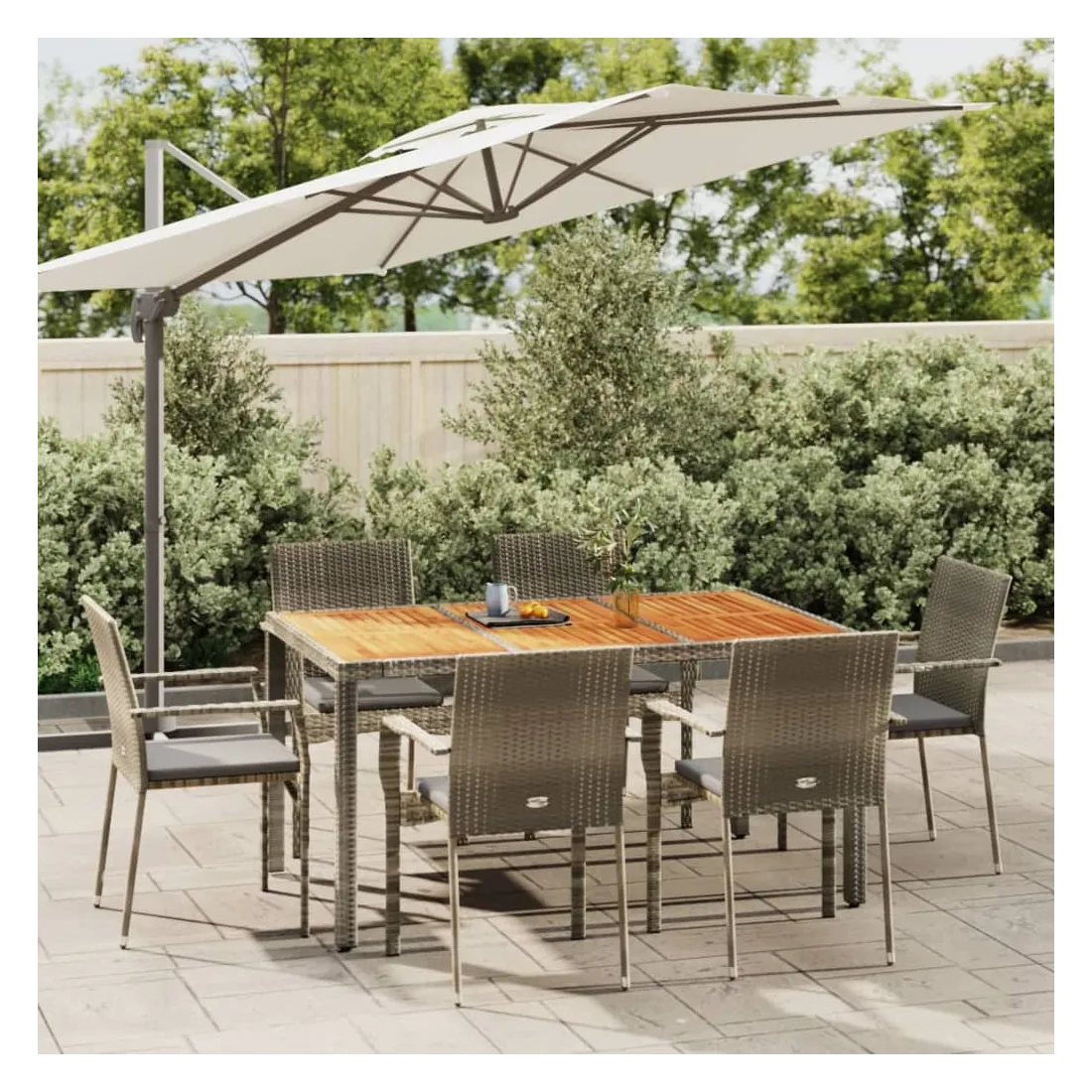 Cet ensemble de salle à manger de jardin tendance, au design élégant et contemporain, est un excellent choix pour manger ou vous détendre dans votre jardin. Matériau résistant aux intempéries : la résine tressée, également connue sous le nom de rotin poly, résiste aux intempéries et est facile à nettoyer. Elle reste belle à l'extérieur pendant une longue période. Elle offre une excellente qualité, commodité et un aspect esthétique.Cadre robuste : les cadres en acier enduit de poudre rendent l'ensemble de salle à manger d'extérieur robuste et stable pour une utilisation quotidienne à l'extérieur.Dessus de table pratique : le dessus de table en bois d'acacia massif est parfait pour placer des boissons, des aliments et des décorations. Il a une belle apparence et est facile à nettoyer.Conception modulaire : l'ensemble de salle à manger de jardin est flexible et facile à déplacer, vous pouvez donc le combiner avec d'autres segments modulaires dans la boutique en ligne pour créer vos propres configurations d'ensemble de salle à manger de jardin !Expérience d'assise confortable : le dossier ajoute un confort d'assise supplémentaire à la chaise de jardin. De plus, les coussins bien rembourrés vous permettent de vous asseoir confortablement. Bon à savoir :Pour faciliter au maximum le montage, chaque produit est livré avec des instructions. Remarque :Pour que vos meubles d'extérieur restent beaux, nous vous recommandons de les protéger avec une housse imperméable.