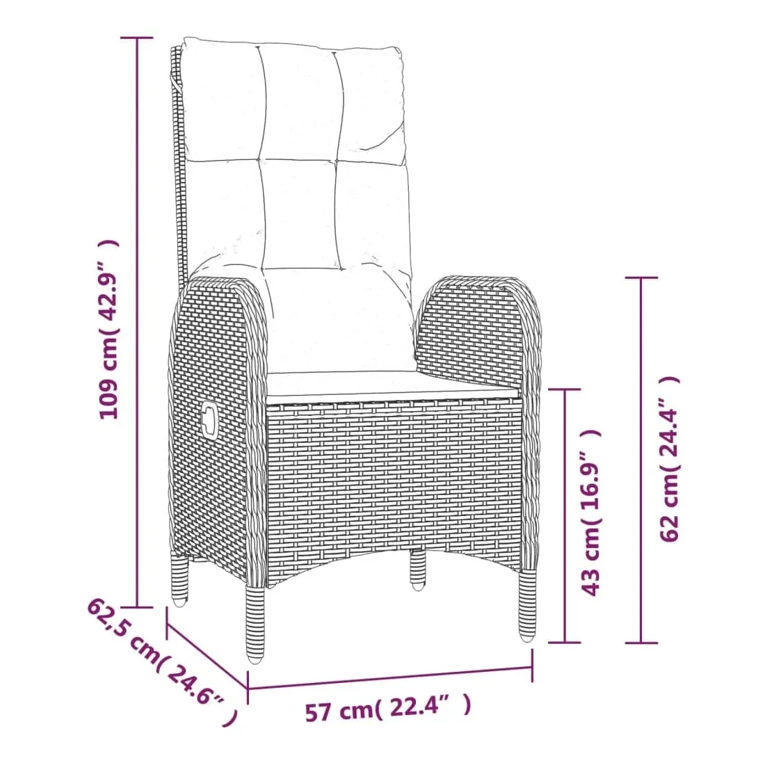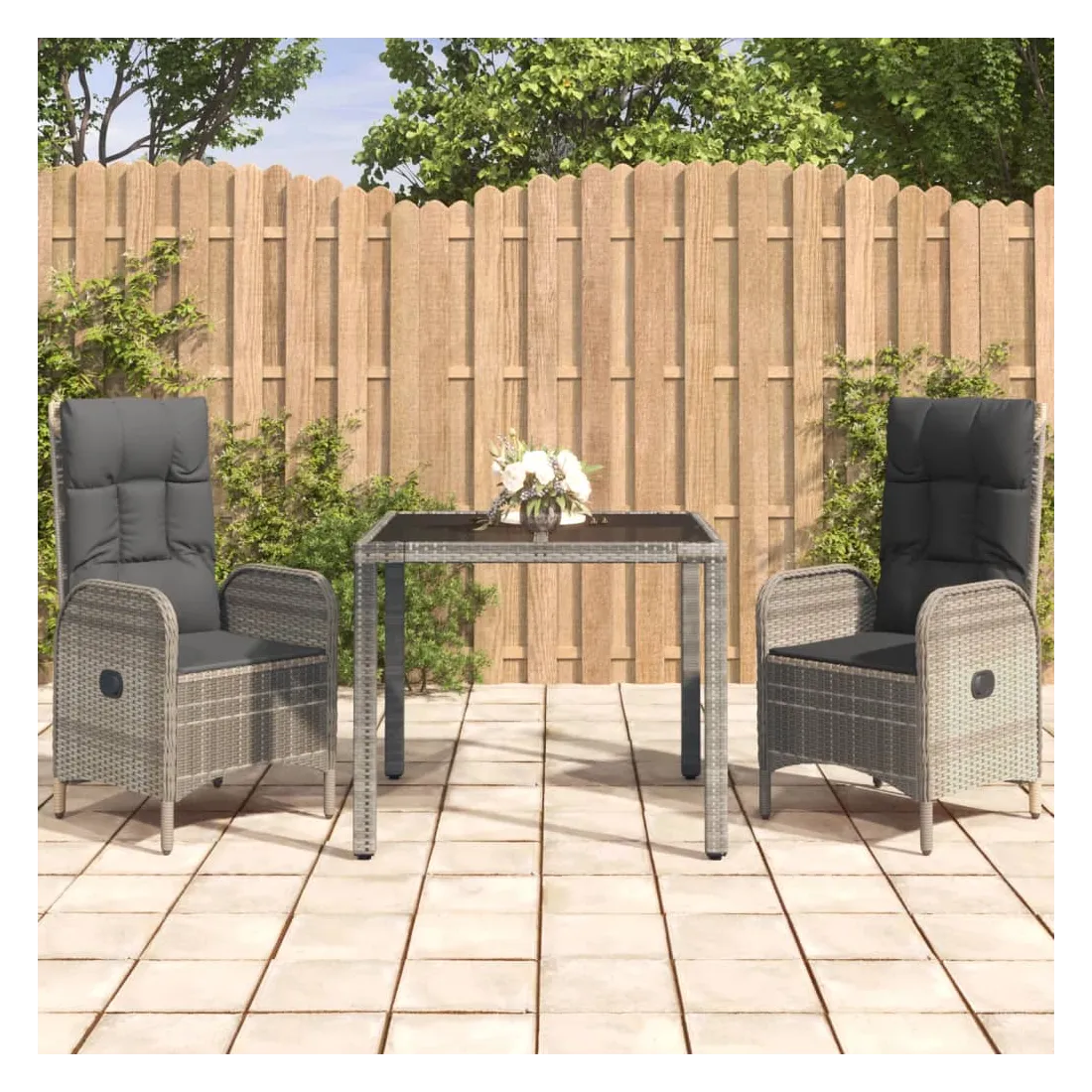 vidaXLCet ensemble de salle à manger de jardin tendance, au design élégant et contemporain, est un excellent choix pour manger ou vous détendre dans votre jardin. Matériau résistant aux intempéries : la résine tressée, également connue sous le nom de rotin poly, résiste aux intempéries et est facile à nettoyer. Elle reste belle à l'extérieur pendant une longue période. Elle offre une excellente qualité, commodité et un aspect esthétique.Cadre robuste : les cadres en acier enduit de poudre rendent l'ensemble de salle à manger d'extérieur robuste et stable pour une utilisation quotidienne à l'extérieur.Dessus de table pratique : le dessus lisse de la table de jardin est en verre trempé, facile à nettoyer avec un chiffon humide. De plus, le dessus robuste est parfait pour placer des repas, des boissons et d'autres objets décoratifs.Fonction d'inclinaison : les chaises de jardin sont spécialement conçues avec une fonction d'inclinaison afin que vous puissiez régler le dossier selon votre confort.Expérience d'assise confortable : le dossier ajoute un confort d'assise supplémentaire à la chaise de jardin. De plus, les coussins bien rembourrés vous permettent de vous asseoir confortablement. Bon à savoir :Pour faciliter au maximum le montage, chaque produit est livré avec des instructions. Remarque :Pour que vos meubles d'extérieur restent beaux, nous vous recommandons de les protéger avec une housse imperméable.