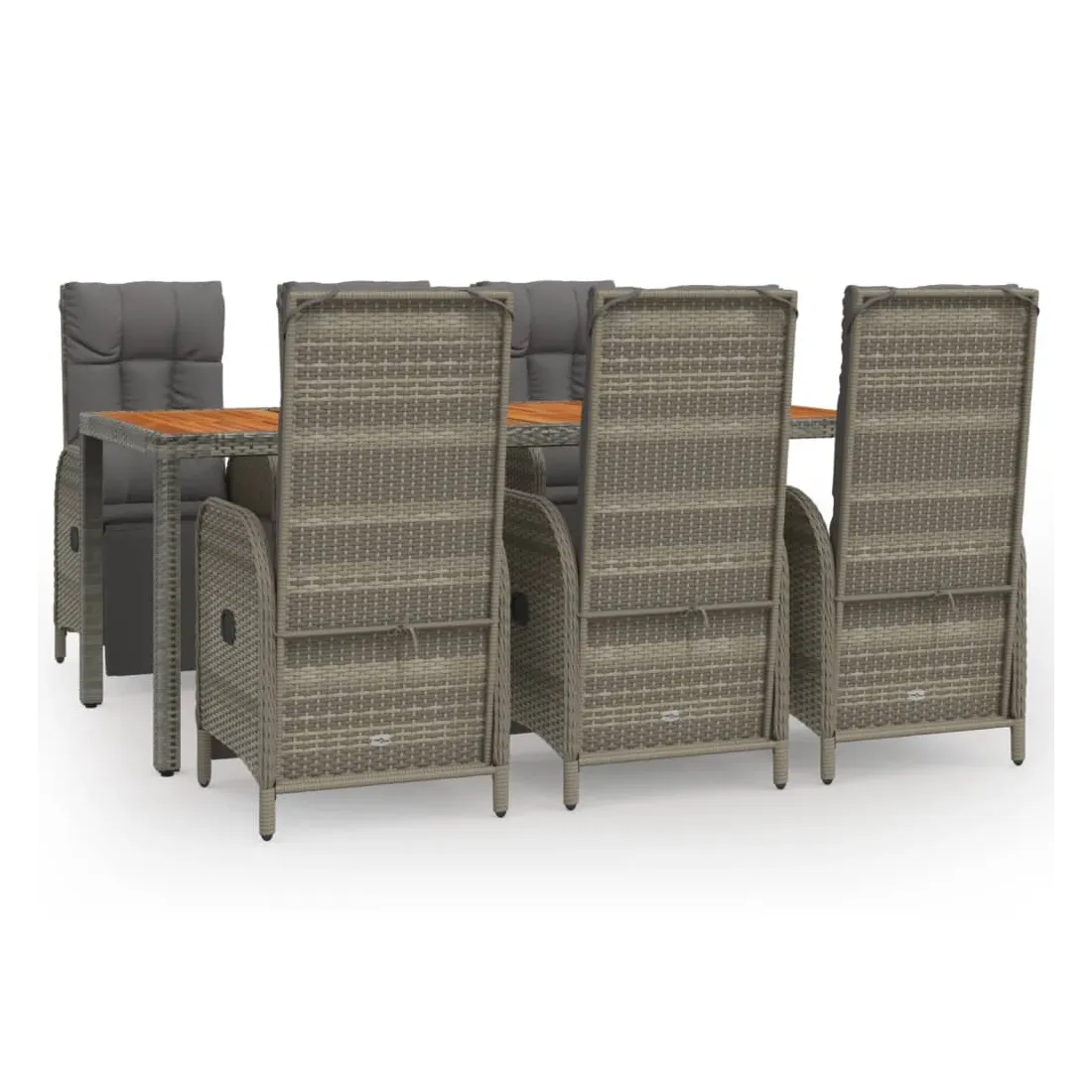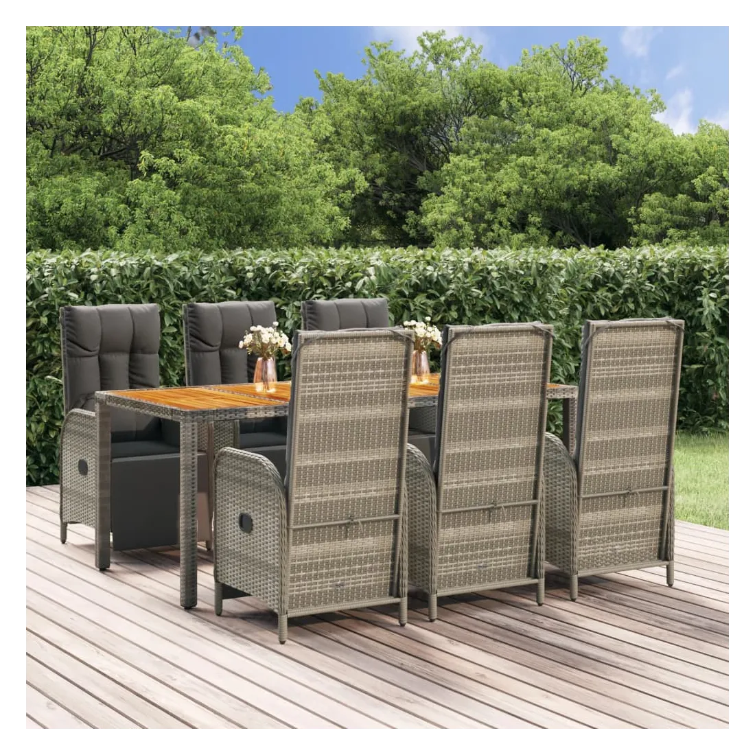 Cet ensemble de salle à manger de jardin tendance, au design élégant et contemporain, est un excellent choix pour manger ou vous détendre dans votre jardin. Matériau résistant aux intempéries : la résine tressée, également connue sous le nom de rotin poly, résiste aux intempéries et est facile à nettoyer. Elle reste belle à l'extérieur pendant une longue période. Elle offre une excellente qualité, commodité et un aspect esthétique.Cadre robuste : les cadres en acier enduit de poudre rendent l'ensemble de salle à manger d'extérieur robuste et stable pour une utilisation quotidienne à l'extérieur.Dessus de table pratique : le dessus de table en bois d'acacia massif est parfait pour placer des boissons, des aliments et des décorations. Il a une belle apparence et est facile à nettoyer.Fonction d'inclinaison : les chaises de jardin sont spécialement conçues avec une fonction d'inclinaison afin que vous puissiez régler le dossier selon votre confort.Expérience d'assise confortable : le dossier ajoute un confort d'assise supplémentaire à la chaise de jardin. De plus, les coussins bien rembourrés vous permettent de vous asseoir confortablement. Bon à savoir :Pour faciliter au maximum le montage, chaque produit est livré avec des instructions. Remarque :Pour que vos meubles d'extérieur restent beaux, nous vous recommandons de les protéger avec une housse imperméable.