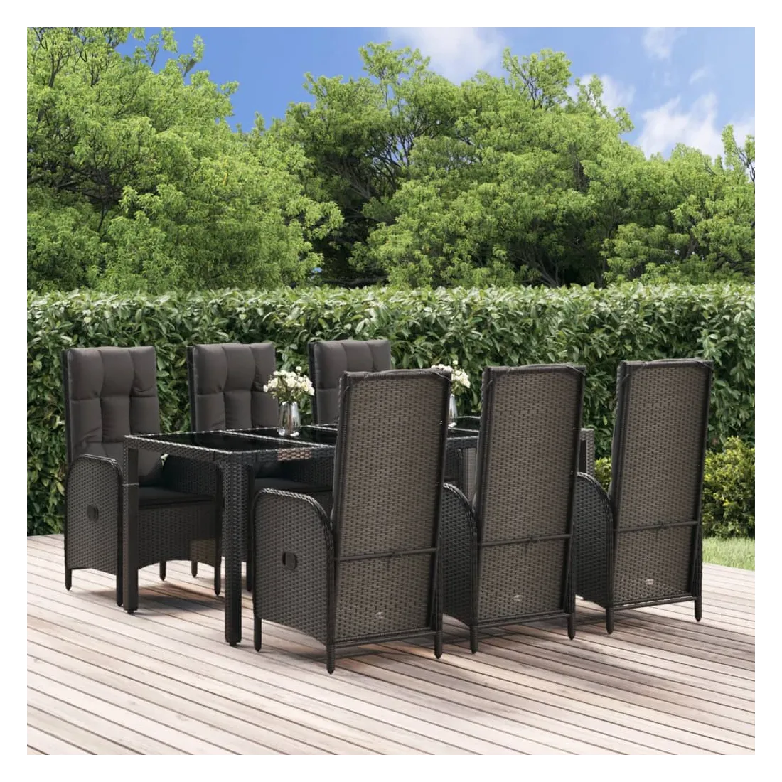 Cet ensemble de salle à manger de jardin tendance, au design élégant et contemporain, est un excellent choix pour manger ou vous détendre dans votre jardin. Matériau résistant aux intempéries : la résine tressée, également connue sous le nom de rotin poly, résiste aux intempéries et est facile à nettoyer. Elle reste belle à l'extérieur pendant une longue période. Elle offre une excellente qualité, commodité et un aspect esthétique.Cadre robuste : les cadres en acier enduit de poudre rendent l'ensemble de salle à manger d'extérieur robuste et stable pour une utilisation quotidienne à l'extérieur.Dessus de table pratique : le dessus lisse de la table de jardin est en verre trempé, facile à nettoyer avec un chiffon humide. De plus, le dessus robuste est parfait pour placer des repas, des boissons et d'autres objets décoratifs.Fonction d'inclinaison : les chaises de jardin sont spécialement conçues avec une fonction d'inclinaison afin que vous puissiez régler le dossier selon votre confort.Expérience d'assise confortable : le dossier ajoute un confort d'assise supplémentaire à la chaise de jardin. De plus, les coussins bien rembourrés vous permettent de vous asseoir confortablement. Bon à savoir :Pour faciliter au maximum le montage, chaque produit est livré avec des instructions. Remarque :Pour que vos meubles d'extérieur restent beaux, nous vous recommandons de les protéger avec une housse imperméable.