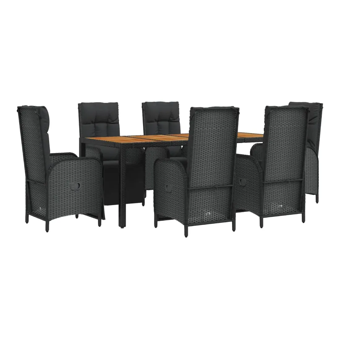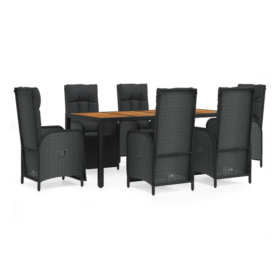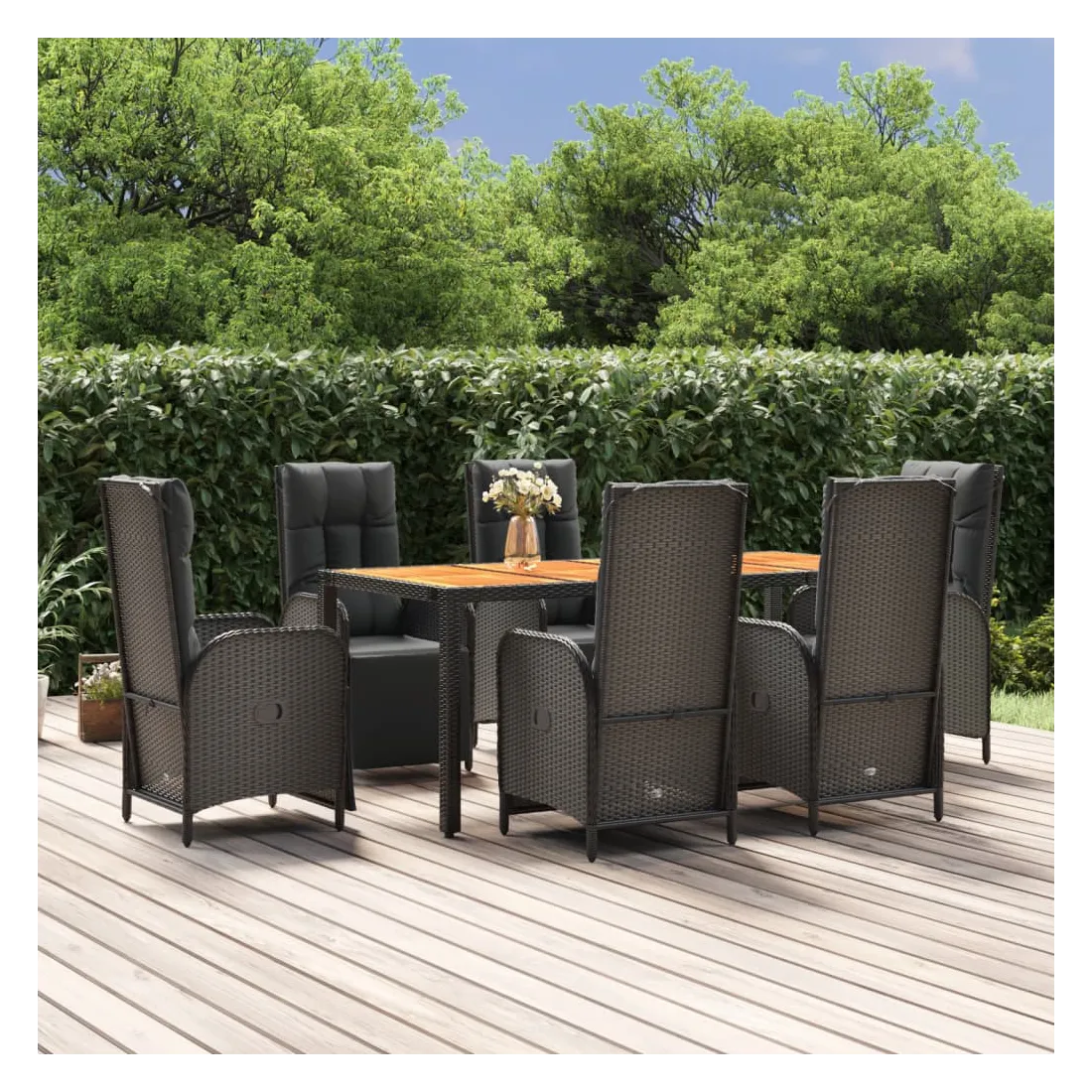 Cet ensemble de salle à manger de jardin tendance, au design élégant et contemporain, est un excellent choix pour manger ou vous détendre dans votre jardin. Matériau résistant aux intempéries : la résine tressée, également connue sous le nom de rotin poly, résiste aux intempéries et est facile à nettoyer. Elle reste belle à l'extérieur pendant une longue période. Elle offre une excellente qualité, commodité et un aspect esthétique.Cadre robuste : les cadres en acier enduit de poudre rendent l'ensemble de salle à manger d'extérieur robuste et stable pour une utilisation quotidienne à l'extérieur.Dessus de table pratique : le dessus de table en bois d'acacia massif est parfait pour placer des boissons, des aliments et des décorations. Il a une belle apparence et est facile à nettoyer.Fonction d'inclinaison : les chaises de jardin sont spécialement conçues avec une fonction d'inclinaison afin que vous puissiez régler le dossier selon votre confort.Expérience d'assise confortable : le dossier ajoute un confort d'assise supplémentaire à la chaise de jardin. De plus, les coussins bien rembourrés vous permettent de vous asseoir confortablement. Bon à savoir :Pour faciliter au maximum le montage, chaque produit est livré avec des instructions. Remarque :Pour que vos meubles d'extérieur restent beaux, nous vous recommandons de les protéger avec une housse imperméable.