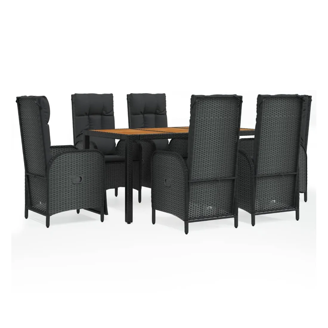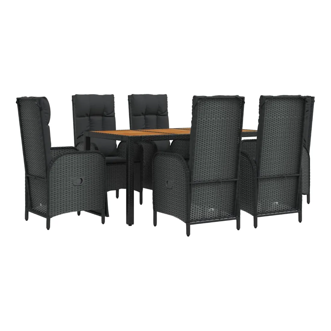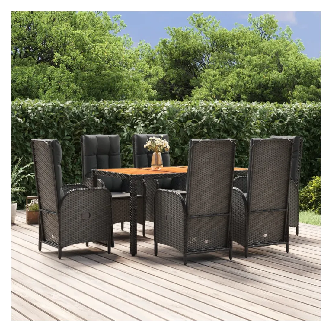 Cet ensemble de salle à manger de jardin tendance, au design élégant et contemporain, est un excellent choix pour manger ou vous détendre dans votre jardin. Matériau résistant aux intempéries : la résine tressée, également connue sous le nom de rotin poly, résiste aux intempéries et est facile à nettoyer. Elle reste belle à l'extérieur pendant une longue période. Elle offre une excellente qualité, commodité et un aspect esthétique.Cadre robuste : les cadres en acier enduit de poudre rendent l'ensemble de salle à manger d'extérieur robuste et stable pour une utilisation quotidienne à l'extérieur.Dessus de table pratique : le dessus de table en bois d'acacia massif est parfait pour placer des boissons, des aliments et des décorations. Il a une belle apparence et est facile à nettoyer.Fonction d'inclinaison : les chaises de jardin sont spécialement conçues avec une fonction d'inclinaison afin que vous puissiez régler le dossier selon votre confort.Expérience d'assise confortable : le dossier ajoute un confort d'assise supplémentaire à la chaise de jardin. De plus, les coussins bien rembourrés vous permettent de vous asseoir confortablement. Bon à savoir :Pour faciliter au maximum le montage, chaque produit est livré avec des instructions. Remarque :Pour que vos meubles d'extérieur restent beaux, nous vous recommandons de les protéger avec une housse imperméable.
