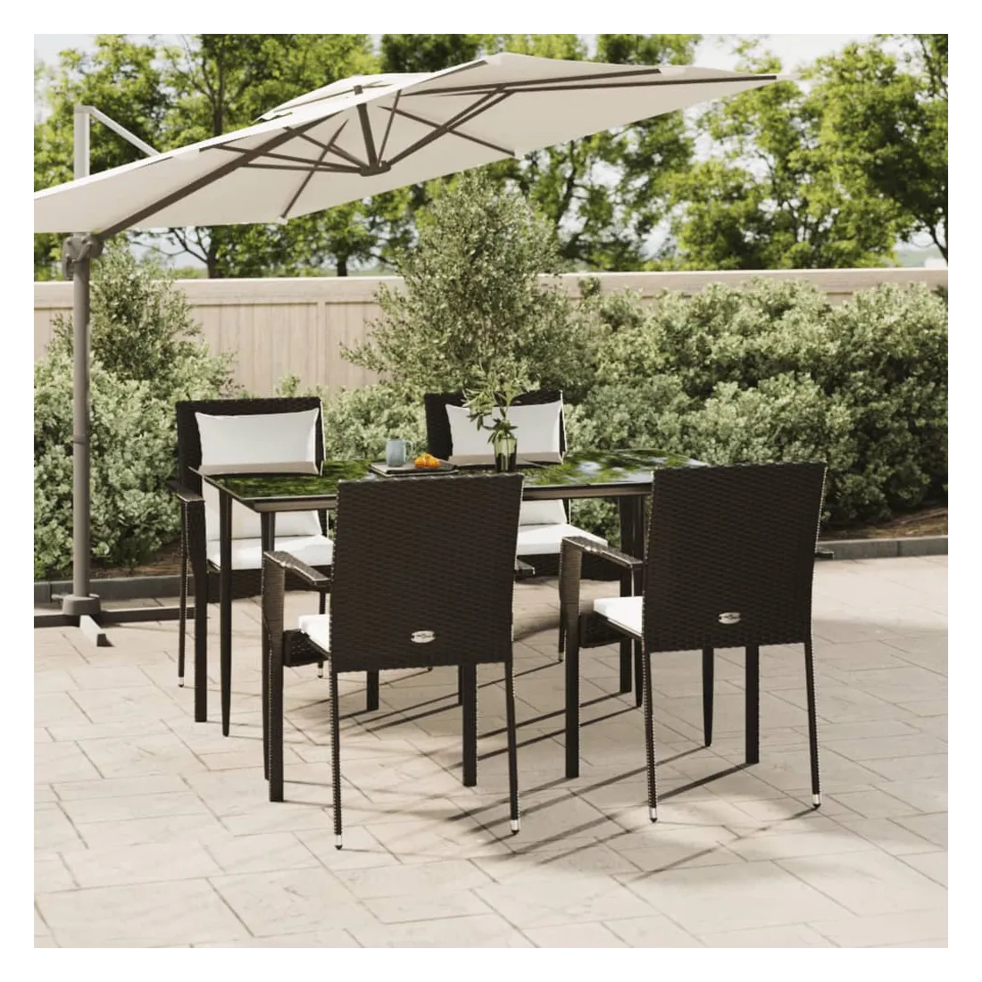 Cet ensemble de salle à manger de jardin tendance, au design élégant et contemporain, est un excellent choix pour manger ou vous détendre dans votre jardin. Matériau résistant aux intempéries : la résine tressée, également connue sous le nom de rotin poly, résiste aux intempéries et est facile à nettoyer. Elle reste belle à l'extérieur pendant une longue période. Elle offre une excellente qualité, commodité et un aspect esthétique.Cadre robuste : les cadres en acier enduit de poudre rendent l'ensemble de salle à manger d'extérieur robuste et stable pour une utilisation quotidienne à l'extérieur.Dessus de table pratique : le dessus lisse de la table de jardin est en verre trempé, facile à nettoyer avec un chiffon humide. De plus, le dessus robuste est parfait pour placer des repas, des boissons et d'autres objets décoratifs.Conception modulaire : l'ensemble de salle à manger de jardin est flexible et facile à déplacer, vous pouvez donc le combiner avec d'autres segments modulaires dans la boutique en ligne pour créer vos propres configurations d'ensemble de salle à manger de jardin !Expérience d'assise confortable : le dossier ajoute un confort d'assise supplémentaire à la chaise de jardin. De plus, les coussins bien rembourrés vous permettent de vous asseoir confortablement. Bon à savoir :Pour faciliter au maximum le montage, chaque produit est livré avec des instructions. Remarque :Pour que vos meubles d'extérieur restent beaux, nous vous recommandons de les protéger avec une housse imperméable.