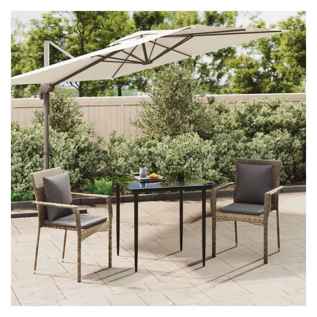 Cet ensemble de salle à manger de jardin tendance, au design élégant et contemporain, est un excellent choix pour manger ou vous détendre dans votre jardin. Matériau résistant aux intempéries : la résine tressée, également connue sous le nom de rotin poly, résiste aux intempéries et est facile à nettoyer. Elle reste belle à l'extérieur pendant une longue période. Elle offre une excellente qualité, commodité et un aspect esthétique.Cadre robuste : les cadres en acier enduit de poudre rendent l'ensemble de salle à manger d'extérieur robuste et stable pour une utilisation quotidienne à l'extérieur.Dessus de table pratique : le dessus lisse de la table de jardin est en verre trempé, facile à nettoyer avec un chiffon humide. De plus, le dessus robuste est parfait pour placer des repas, des boissons et d'autres objets décoratifs.Conception modulaire : l'ensemble de salle à manger de jardin est flexible et facile à déplacer, vous pouvez donc le combiner avec d'autres segments modulaires dans la boutique en ligne pour créer vos propres configurations d'ensemble de salle à manger de jardin !Expérience d'assise confortable : le dossier ajoute un confort d'assise supplémentaire à la chaise de jardin. De plus, les coussins bien rembourrés vous permettent de vous asseoir confortablement. Bon à savoir :Pour faciliter au maximum le montage, chaque produit est livré avec des instructions. Remarque :Pour que vos meubles d'extérieur restent beaux, nous vous recommandons de les protéger avec une housse imperméable.