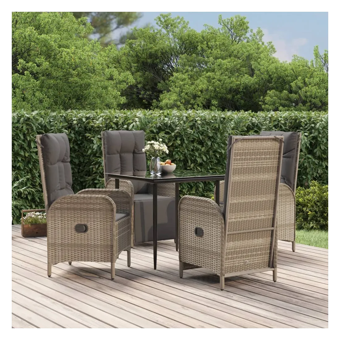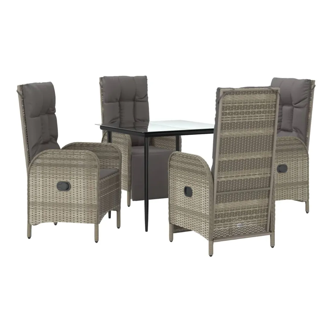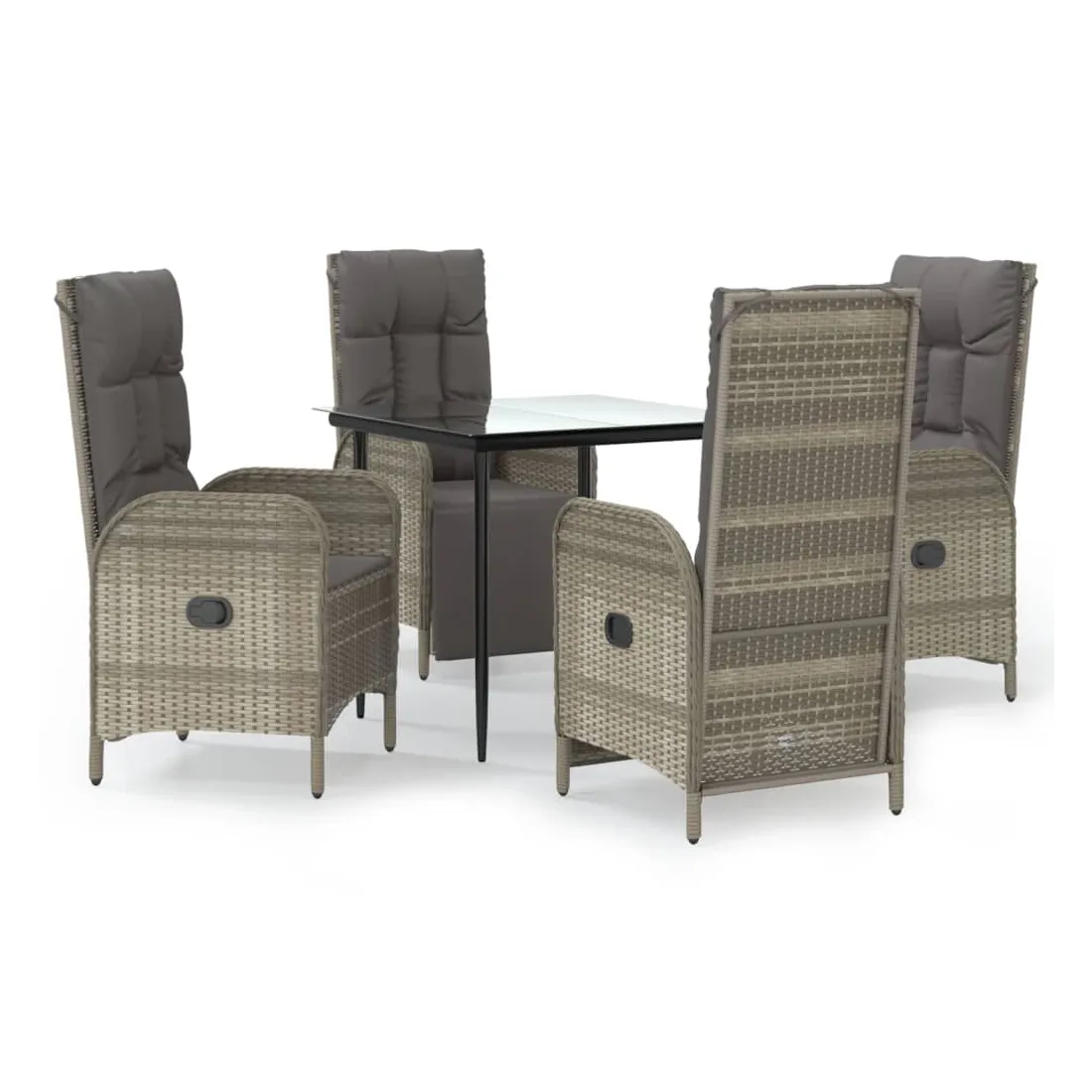 Cet ensemble de salle à manger de jardin tendance, au design élégant et contemporain, est un excellent choix pour manger ou vous détendre dans votre jardin. Matériau résistant aux intempéries : la résine tressée, également connue sous le nom de rotin poly, résiste aux intempéries et est facile à nettoyer. Elle reste belle à l'extérieur pendant une longue période. Elle offre une excellente qualité, commodité et un aspect esthétique.Cadre robuste : les cadres en acier enduit de poudre rendent l'ensemble de salle à manger d'extérieur robuste et stable pour une utilisation quotidienne à l'extérieur.Dessus de table pratique : le dessus lisse de la table de jardin est en verre trempé, facile à nettoyer avec un chiffon humide. De plus, le dessus robuste est parfait pour placer des repas, des boissons et d'autres objets décoratifs.Fonction d'inclinaison : les chaises de jardin sont spécialement conçues avec une fonction d'inclinaison afin que vous puissiez régler le dossier selon votre confort.Expérience d'assise confortable : le dossier ajoute un confort d'assise supplémentaire à la chaise de jardin. De plus, les coussins bien rembourrés vous permettent de vous asseoir confortablement. Bon à savoir :Pour faciliter au maximum le montage, chaque produit est livré avec des instructions. Remarque :Pour que vos meubles d'extérieur restent beaux, nous vous recommandons de les protéger avec une housse imperméable.