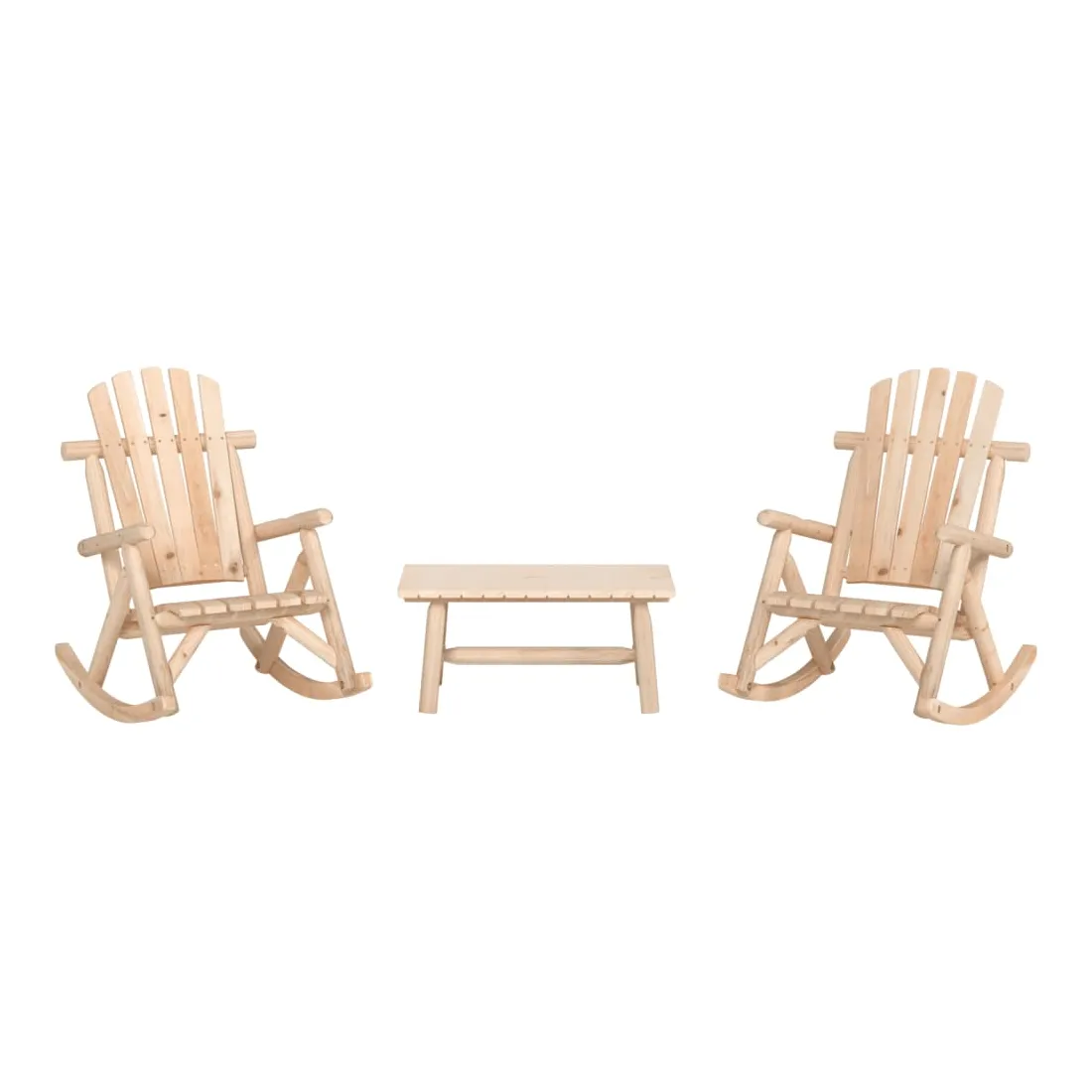 Profitez d'un moment de loisirs confortable avec votre famille dans votre espace extérieur sur cet ensemble de salon de jardin en bois ! Bois d'épicéa massif : fabriquée en bois d'épicéa massif, l'ensemble de salon est durable et stable.Design à bascule : détendez-vous en vous asseyant confortablement sur les chaises à bascule de jardin tout en profitant d'un mouvement de basculement doux et apaisant.Expérience de siège confortable : avec des sièges incurvés, des accoudoirs et des dossiers de style Adirondack, les chaises longues vous permettent de vous asseoir confortablement après une longue journée.Dessus de table robuste : le dessus de table robuste de la table basse est idéal pour poser la vaisselle, les boissons et les collations. Bon à savoir :Pour que vos meubles d'extérieur restent beaux, nous vous recommandons de les protéger avec une housse imperméable.Il est recommandé de traiter le bois avec une peinture d'extérieur, afin de prolonger la durée de vie du produit.