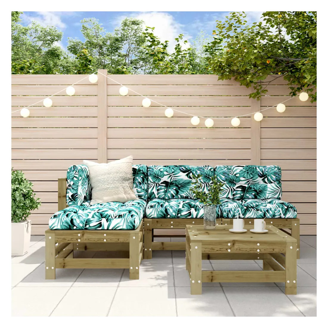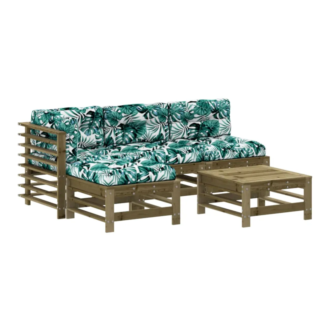 Ce salon de jardin en bois, qui se démarque par son design à lattes et ses coussins moelleux, sera un excellent supplément à votre jardin, patio ou terrasse pour profiter d'un moment agréable avec votre famille ou vos amis. Bois imprégné : le bois de pin massif est un matériau naturel magnifique. Le bois de pin a un grain droit et les nœuds lui confèrent un aspect rustique caractéristique. L'imprégnation est un processus de conservation réalisé à l'aide d'autoclaves. Le traitement sous pression augmente la résistance à la pourriture et aux intempéries.Expérience d'assise confortable : le dossier et l'accoudoir ajoutent un confort d'assise supplémentaire à l'ensemble de meubles de jardin. De plus, les coussins bien rembourrés vous permettent de vous asseoir confortablement.Design modulaire : le canapé est flexible et facile à déplacer. Vous pouvez le combiner avec d'autres segments modulaires de la boutique en ligne pour créer vos propres configurations de salon de jardin ! Bon à savoir :Pour que vos meubles d'extérieur restent beaux, nous vous recommandons de les protéger avec une housse imperméable.
