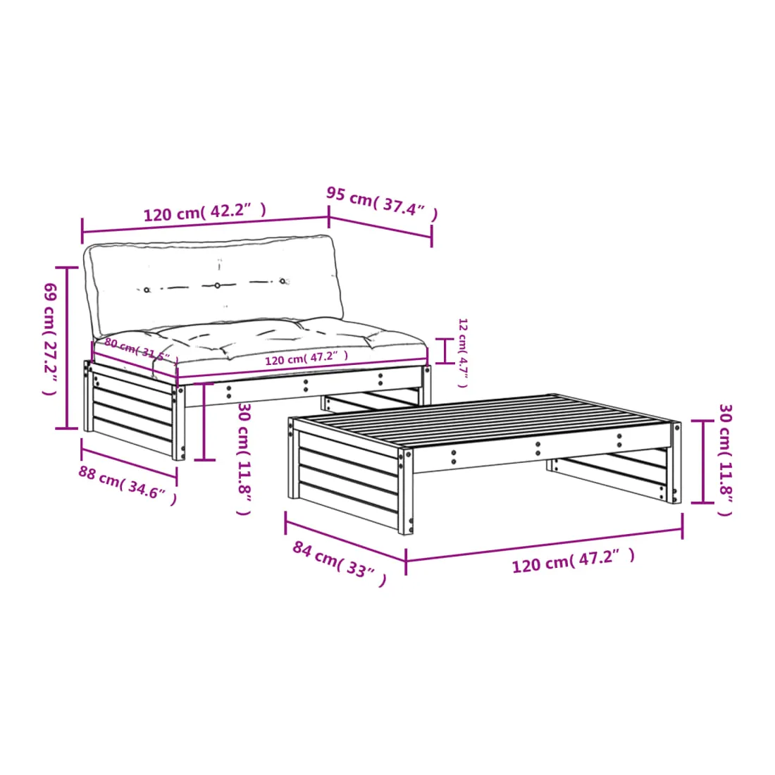 - Dimensions du repose-pied/de la table basse de jardin : 120 x 84 x 30 cm (L x l x H)