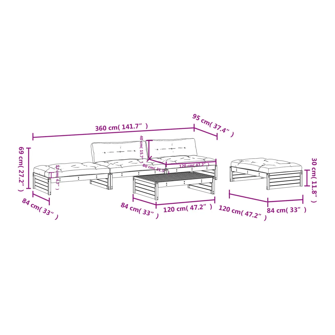 - Dimensions du repose-pied/de la table basse de jardin : 120 x 84 x 30 cm (L x l x H)