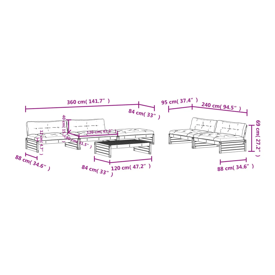- Dimensions du canapé central : 120 x 95 x 69 cm (L x l x H)