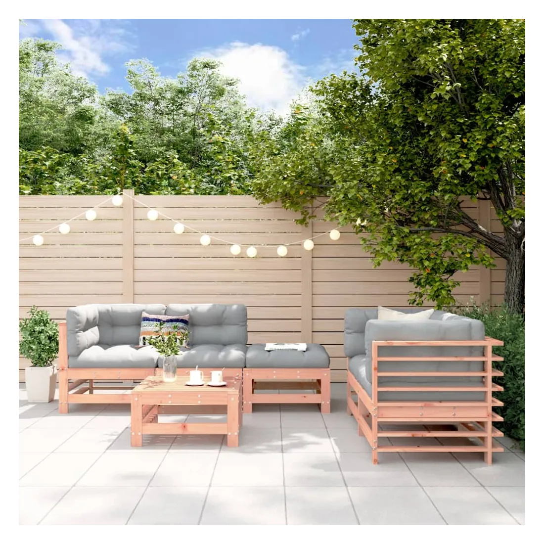 Ce salon de jardin en bois, qui se démarque par son design à lattes, sera un excellent supplément à votre jardin, patio ou terrasse pour profiter d'un moment agréable avec votre famille ou vos amis. Bois de douglas massif : le bois de douglas massif est un bois très durable qui fonctionne bien à l'extérieur. Le bois de douglas est également suffisamment solide pour être travaillé avec un minimum de soin, même sous l'influence des intempéries.Cadre robuste et stable : les cadres en bois rendent l'ensemble de salon robuste et stable pour une utilisation quotidienne à l'extérieur.Design modulaire : le canapé est flexible et facile à déplacer. Vous pouvez le combiner avec d'autres segments modulaires de la boutique en ligne pour créer vos propres configurations de salon de jardin ! Bon à savoir :Pour que vos meubles d'extérieur restent beaux, nous vous recommandons de les protéger avec une housse imperméable.Les coussins ne sont pas inclus dans la livraison.