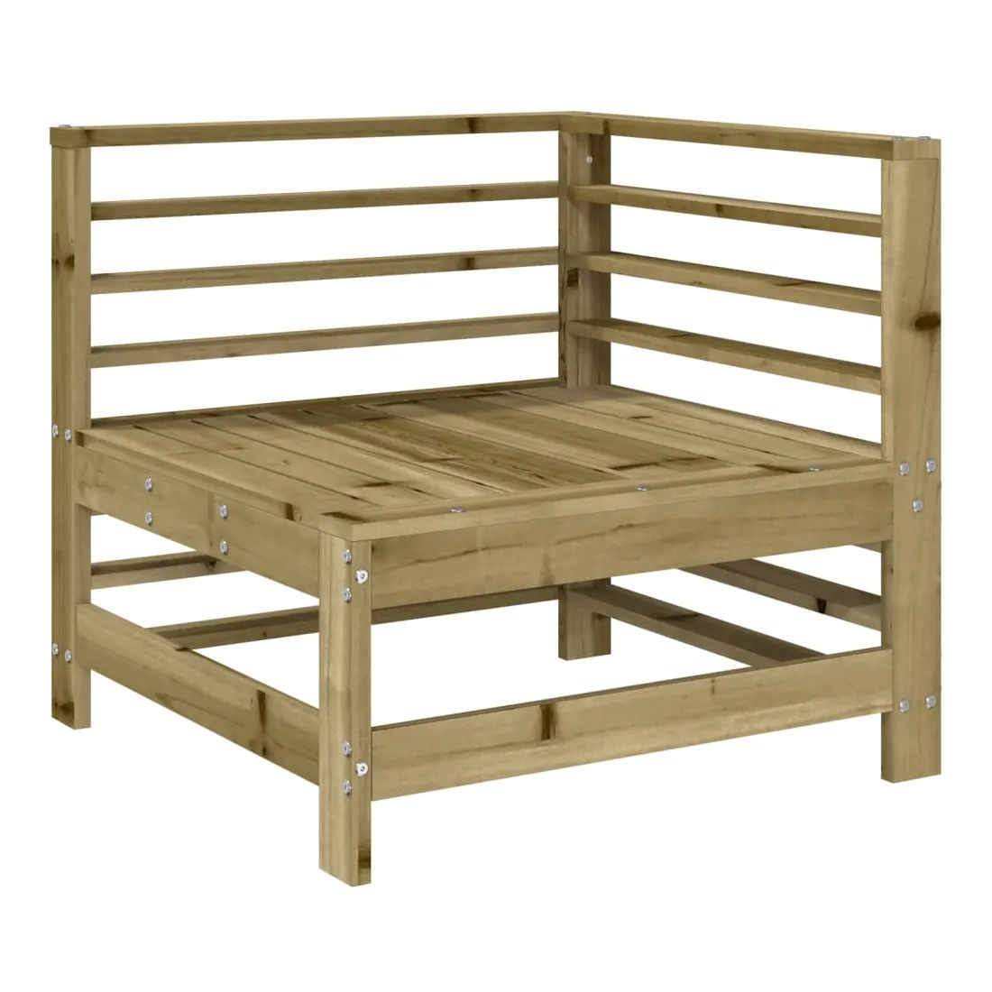 Ce salon de jardin en bois, qui se démarque par son design à lattes, sera un excellent supplément à votre jardin, patio ou terrasse pour profiter d'un moment agréable avec votre famille ou vos amis. Bois imprégné : le bois de pin massif est un matériau naturel magnifique. Le bois de pin a un grain droit et les nœuds lui confèrent un aspect rustique caractéristique. L'imprégnation est un processus de conservation réalisé à l'aide d'autoclaves. Le traitement sous pression augmente la résistance à la pourriture et aux intempéries.Cadre robuste et stable : les cadres en bois rendent l'ensemble de salon robuste et stable pour une utilisation quotidienne à l'extérieur.Design modulaire : le canapé est flexible et facile à déplacer. Vous pouvez le combiner avec d'autres segments modulaires de la boutique en ligne pour créer vos propres configurations de salon de jardin ! Bon à savoir :Pour que vos meubles d'extérieur restent beaux, nous vous recommandons de les protéger avec une housse imperméable.Les coussins ne sont pas inclus dans la livraison.
