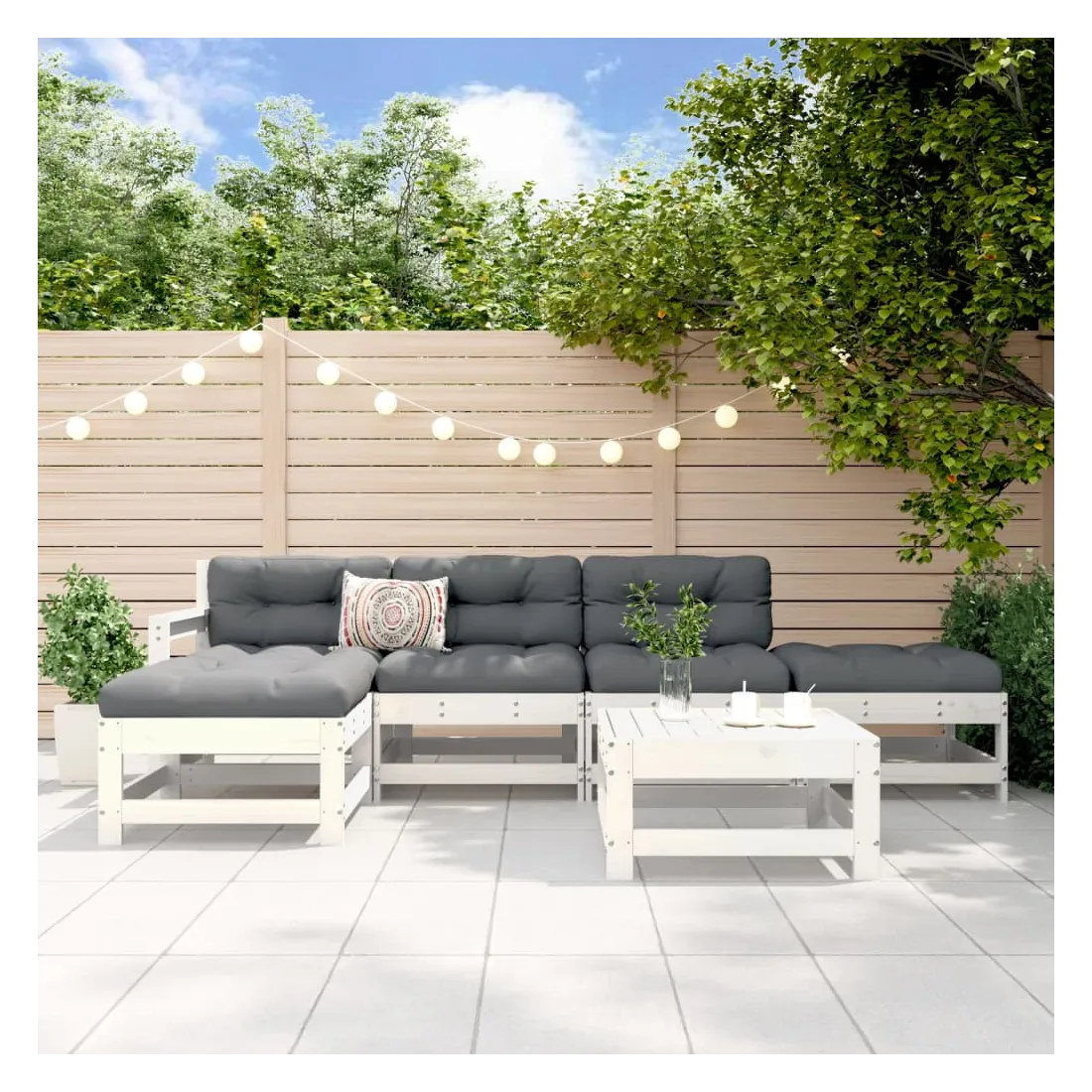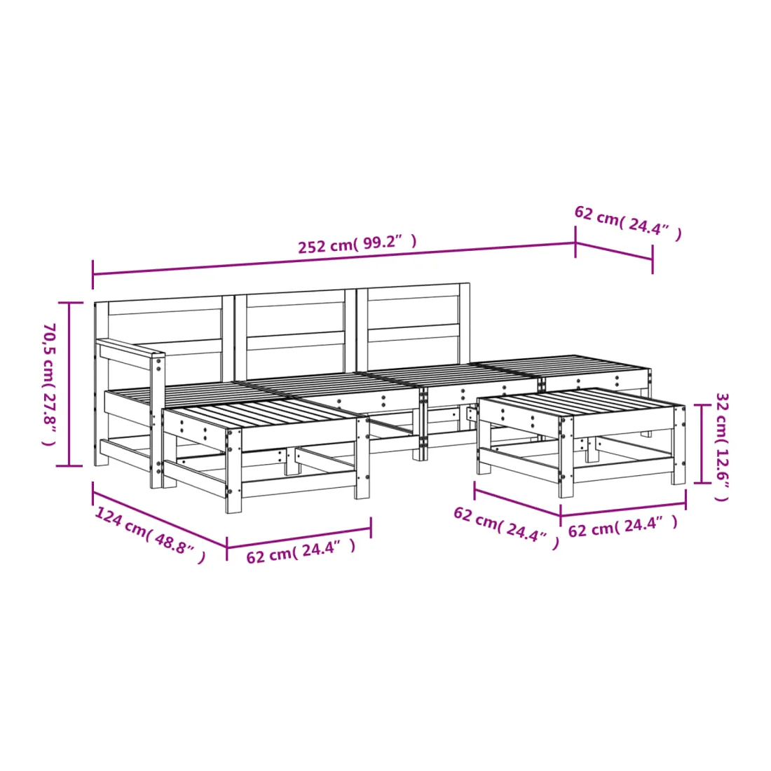 Ce salon de jardin en bois, qui se démarque par son design à lattes, sera un excellent supplément à votre jardin, patio ou terrasse pour profiter d'un moment agréable avec votre famille ou vos amis. Bois de pin massif : le bois de pin massif est un matériau naturel magnifique. Le bois de pin a un grain droit et les nœuds donnent au matériau son aspect caractéristique et rustique.Cadre robuste et stable : les cadres en bois rendent l'ensemble de salon robuste et stable pour une utilisation quotidienne à l'extérieur.Design modulaire : le canapé est flexible et facile à déplacer. Vous pouvez le combiner avec d'autres segments modulaires de la boutique en ligne pour créer vos propres configurations de salon de jardin ! Bon à savoir :Pour que vos meubles d'extérieur restent beaux, nous vous recommandons de les protéger avec une housse imperméable.Les coussins ne sont pas inclus dans la livraison.