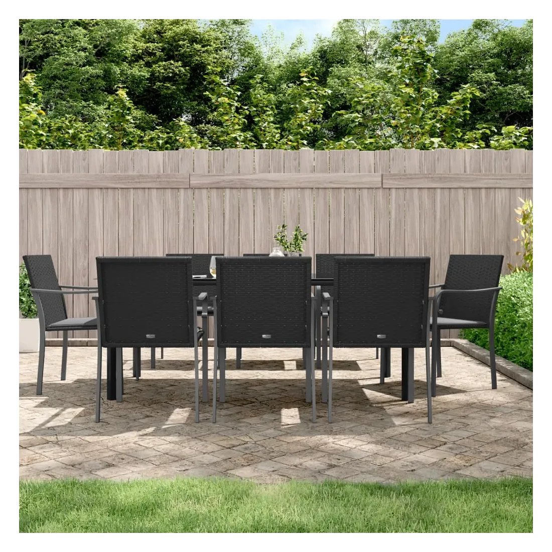 Cet ensemble à manger de jardin, combinant à la fois style et fonctionnalité, est sûrement destiné à être la pièce maîtresse de votre jardin, terrasse et de tout autre espace de vie. Matériau résistant aux intempéries : la résine tressée, également connue sous le nom de rotin poly, résiste aux intempéries et est facile à nettoyer. Elle reste belle à l'extérieur pendant une longue période. Elle offre une excellente qualité, commodité et un aspect esthétique.Cadre robuste et stable : les cadres en acier rendent l'ensemble à manger robuste et stable pour une utilisation quotidienne à l'extérieur.Dessus de table pratique : le plateau lisse de la table à manger est en verre trempé facile à nettoyer avec un chiffon humide. De plus, il offre un excellent support pour contenir vos repas, boissons et autres objets décoratifs.Assise confortable : la chaise de salle à manger est conçue avec des accoudoirs pour vous offrir une expérience d'assise confortable. Le coussin de siège épais et rembourré offre un confort ultime pendant votre temps d'assise. Remarque :Pour que vos meubles d'extérieur restent beaux, nous vous recommandons de les protéger avec une housse imperméable.