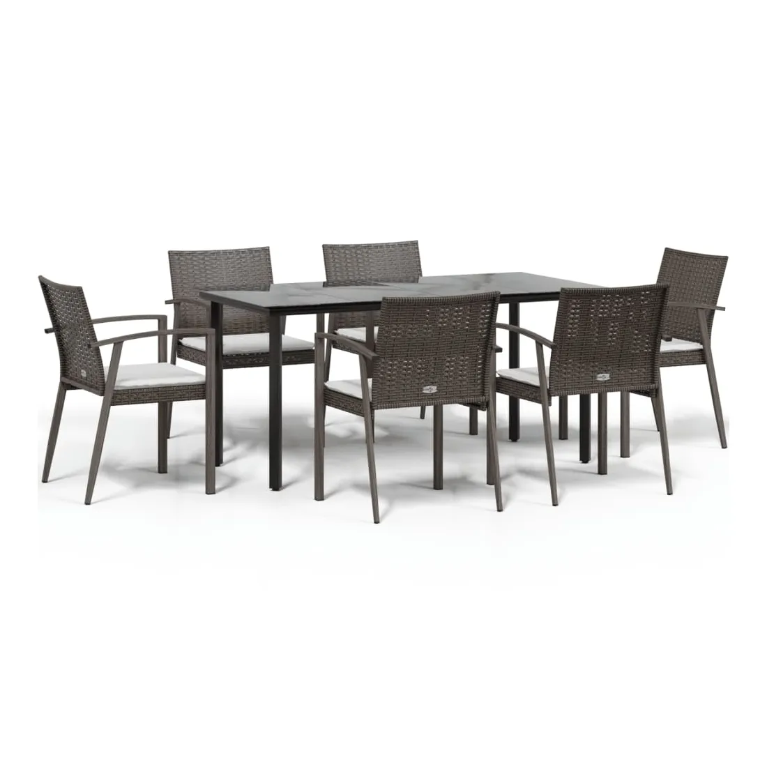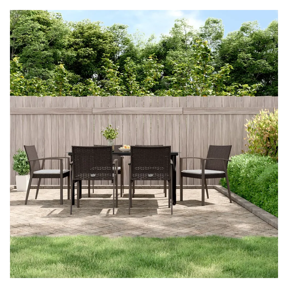 Cet ensemble à manger de jardin, combinant à la fois style et fonctionnalité, est sûrement destiné à être la pièce maîtresse de votre jardin, terrasse et de tout autre espace de vie. Matériau résistant aux intempéries : la résine tressée, également connue sous le nom de rotin poly, résiste aux intempéries et est facile à nettoyer. Elle reste belle à l'extérieur pendant une longue période. Elle offre une excellente qualité, commodité et un aspect esthétique.Cadre robuste et stable : les cadres en acier rendent l'ensemble à manger robuste et stable pour une utilisation quotidienne à l'extérieur.Dessus de table pratique : le plateau lisse de la table à manger est en verre trempé facile à nettoyer avec un chiffon humide. De plus, il offre un excellent support pour contenir vos repas, boissons et autres objets décoratifs.Assise confortable : la chaise de salle à manger est conçue avec des accoudoirs pour vous offrir une expérience d'assise confortable. Le coussin de siège épais et rembourré offre un confort ultime pendant votre temps d'assise. Remarque :Pour que vos meubles d'extérieur restent beaux, nous vous recommandons de les protéger avec une housse imperméable.